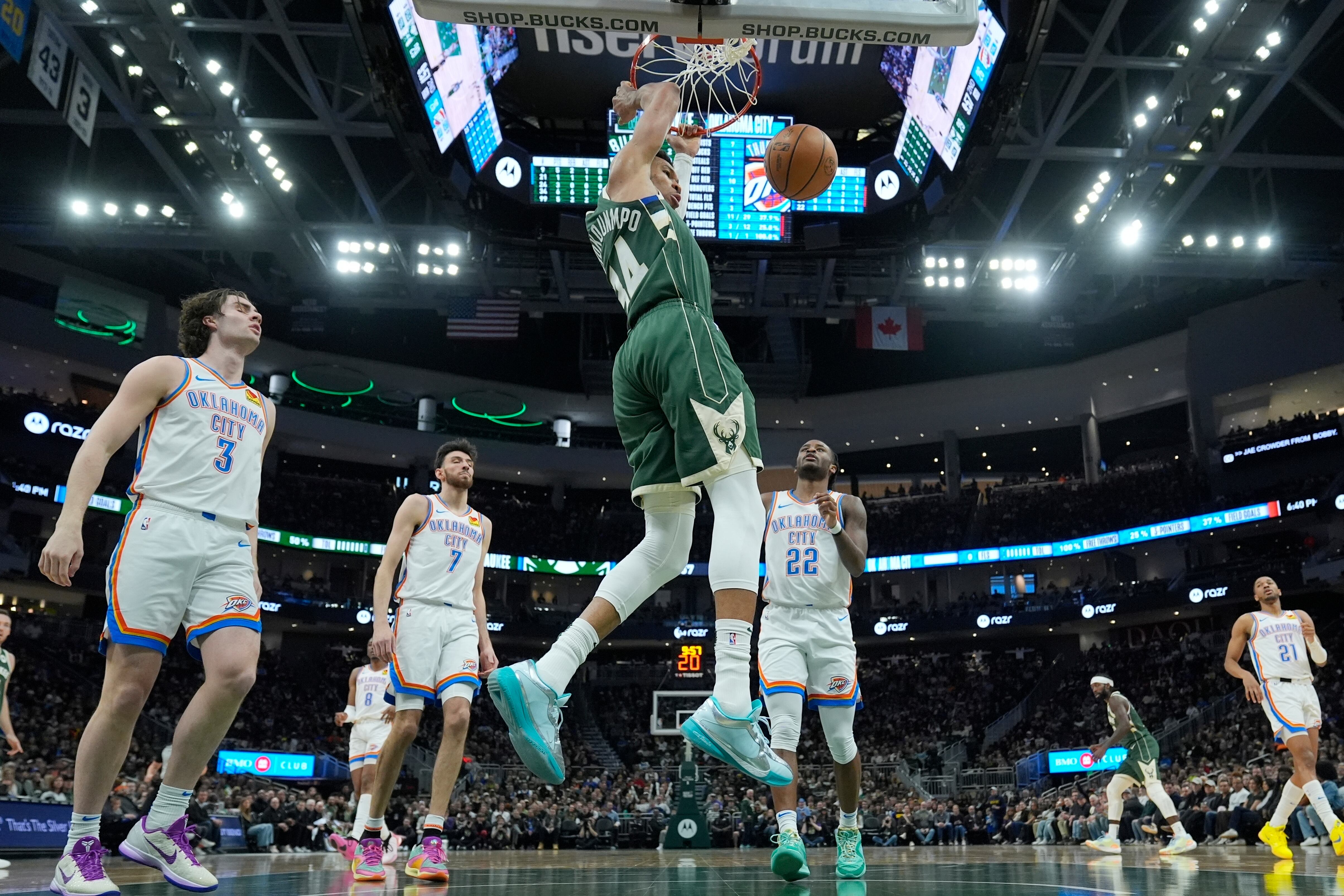 Oklahoma City tuvo la menor cantidad de puntos y el porcentaje de tiro (.371) más bajo de la campaña. Shai Gilgeous-Alexander contó con 12 puntos —la primera vez desde el 19 de enero que tuvo menos de 20— y fue enviado a la banca todo el cuarto periodo debido a que los Bucks tenían una amplia ventaja.
