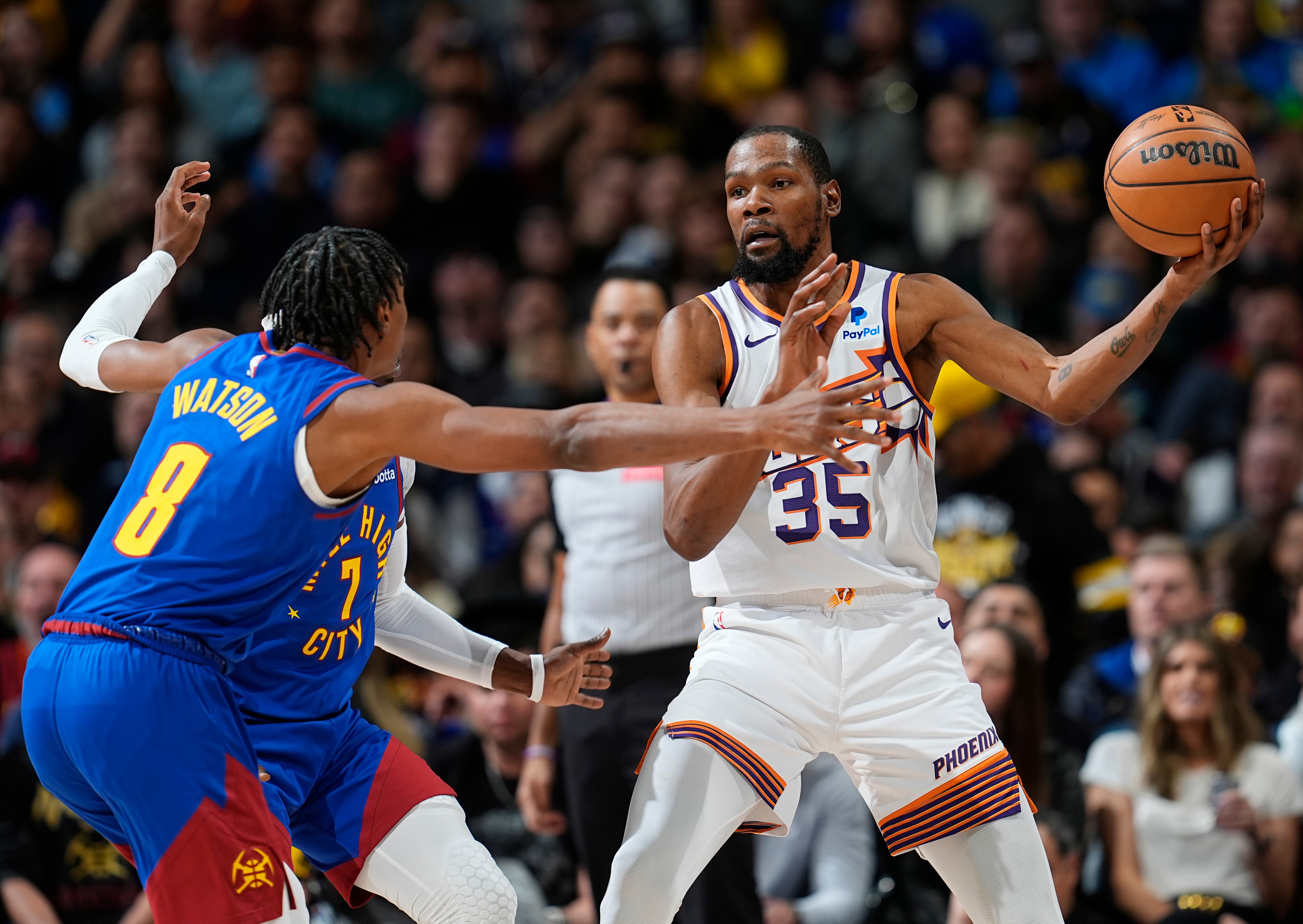 Kevin Durant sumó 30 puntos, 13 rebotes y cinco tapas para que los Suns de Phoenix consiguieran su segundo triunfo de este mes en Denver, al superar el miércoles 104-97 a los Nuggets, campeones defensores de la NBA.
