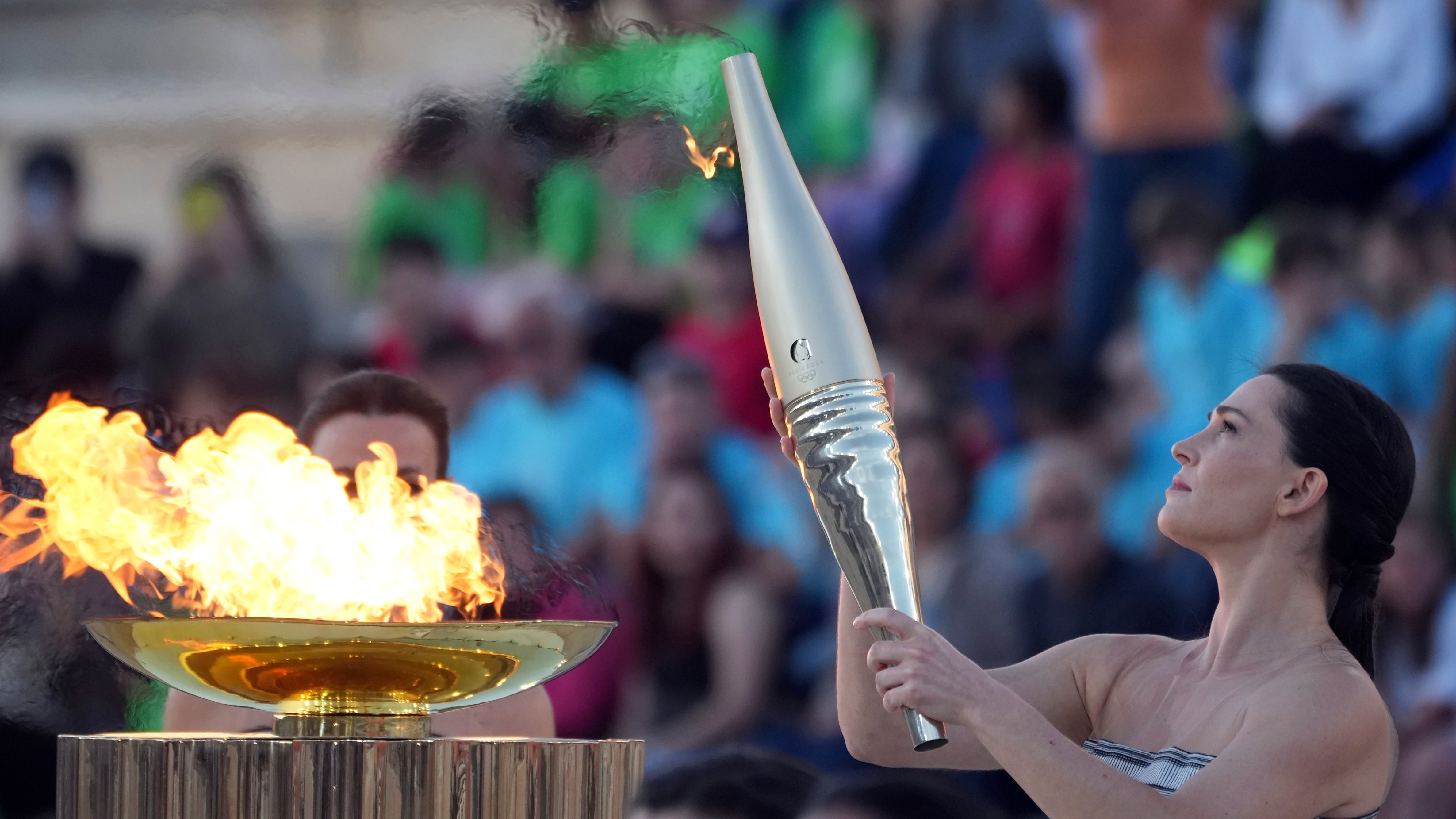 Ioannis Fountoulis, un jugador de water polo griego y el último de varios portadores de la antorcha, encendió la llama en el Estadio Panatenaico. Acto seguida, fue entregada a Tony Estanguet, el director del comité organizador de París 2024.