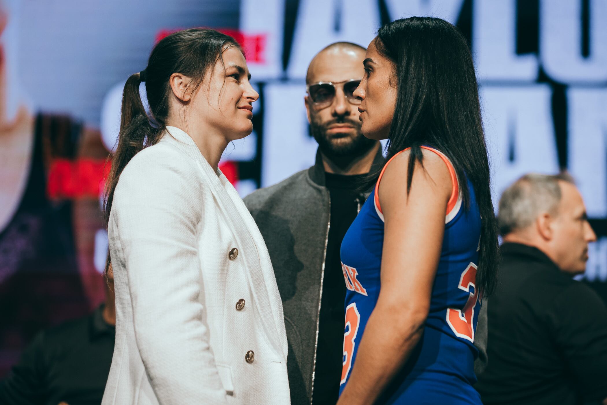 La boxeadora Amanda Serrano y Katie Taylor se vieron las caras hoy, lunes, en la conferencia de prensa en el el icónico Teatro Apollo de Nueva York.