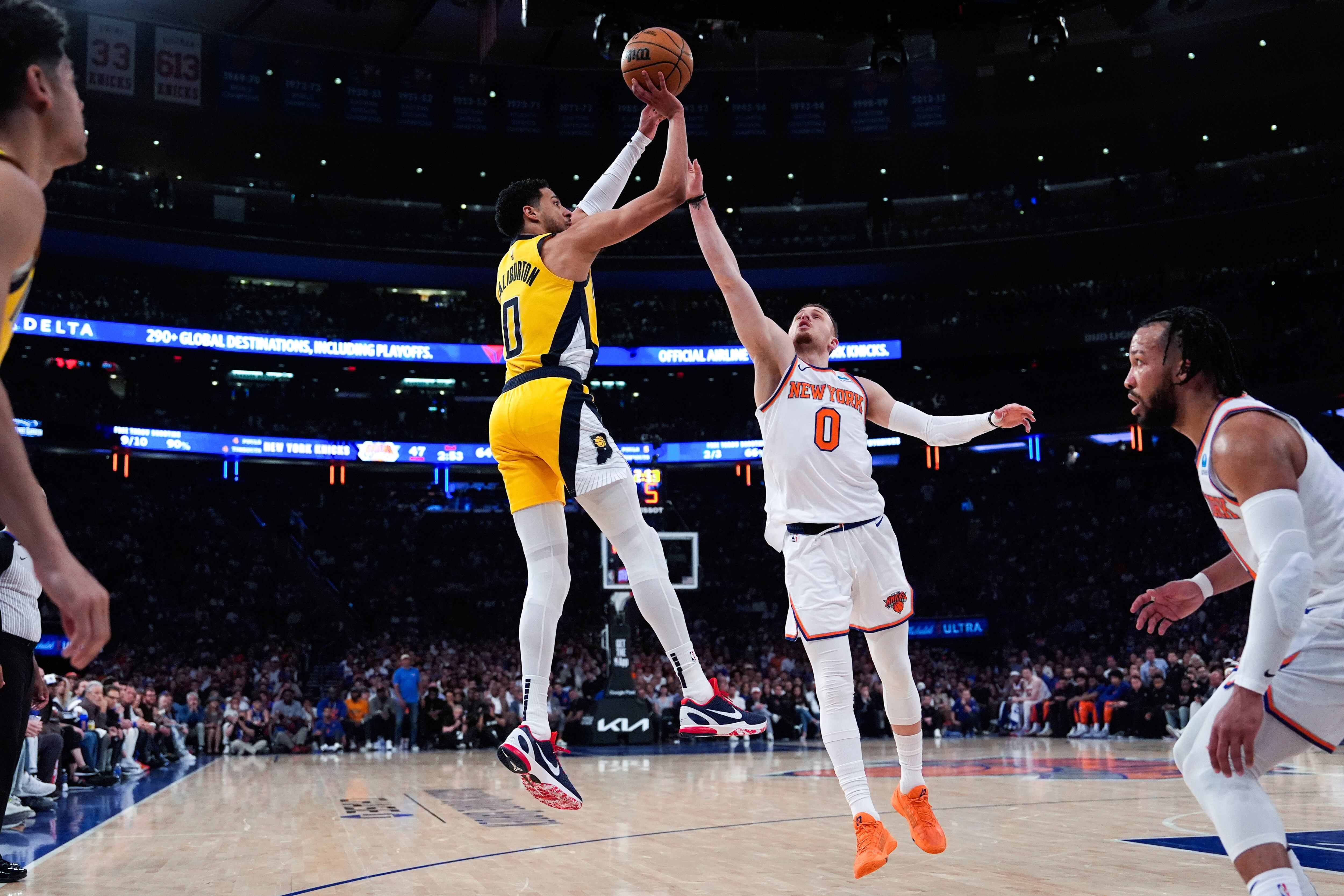 Los Pacers atinaron 29 de sus 38 tiros en la primera mitad, un porcentaje de tiros de 76.3% que fue el más alto de la postemporada desde 1997, cuando la NBA comenzó a llevar registro detallado de jugada a jugada en todos los periodos. Lideraban 70-55 en ese momento y se escapaban cada vez que los Knicks intentaban recuperarse en la segunda mitad.