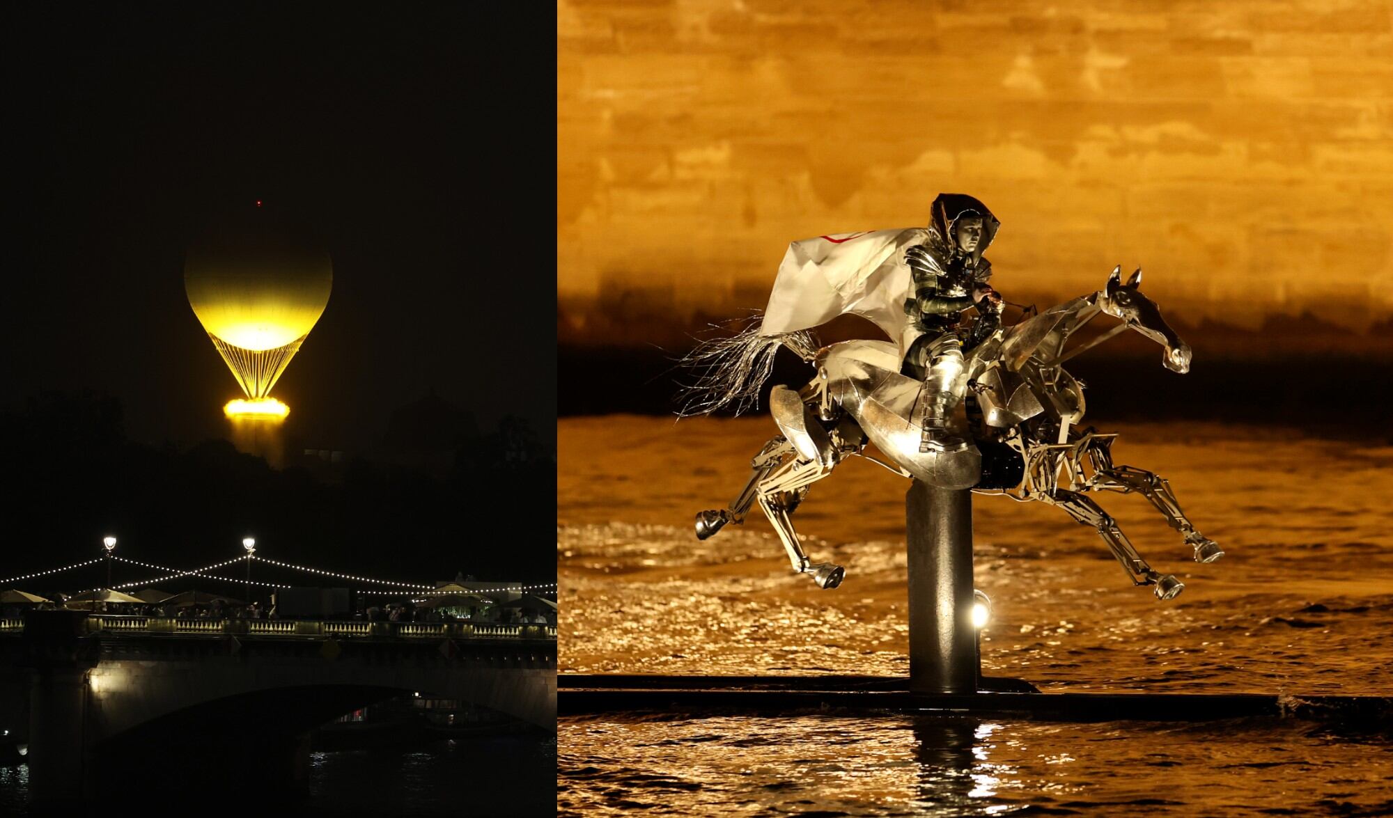 Finalmente, y luego de que las delegaciones llegaran los pies de la Torre Eiffel, la representación de Juana de Arco, heroína de Francia en la fase final de la guerra de los Cien Años, cruzó el Río Sena a caballo para elevar la bandera olímpica. Por su parte, el enmascarado entregó el fuego para luego ser llevado a un pebetero en forma de globo aerostático, un transporte inventado en Portugal en 1709, pero probado en Francia hasta 1783.