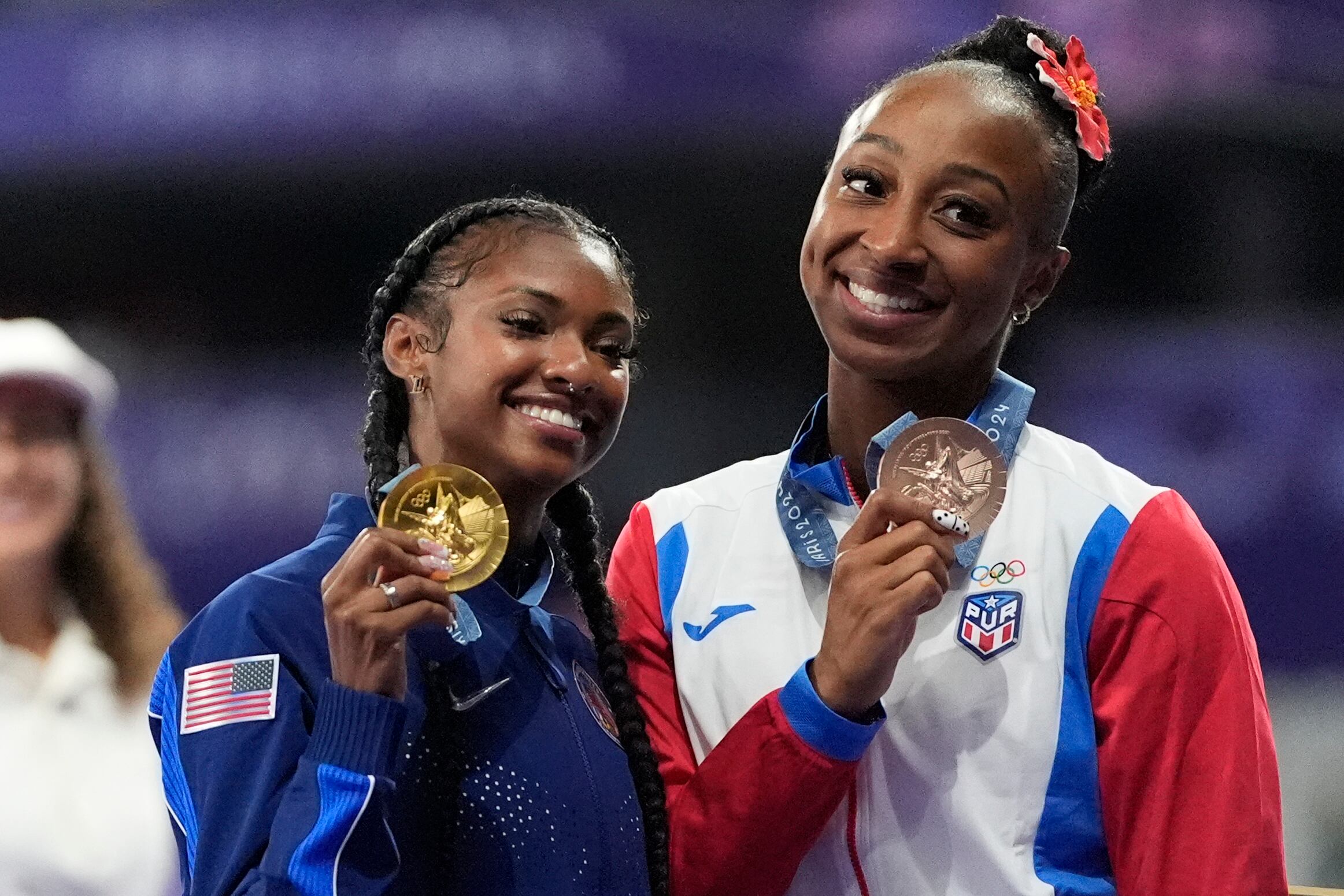 La medallista olímpica puertorriqueña Jasmine Camacho-Quinn recibió su medalla de bronce de los Juegos Olímpicos de París 2024 tras culminar la final de los 100 metros con valla.
