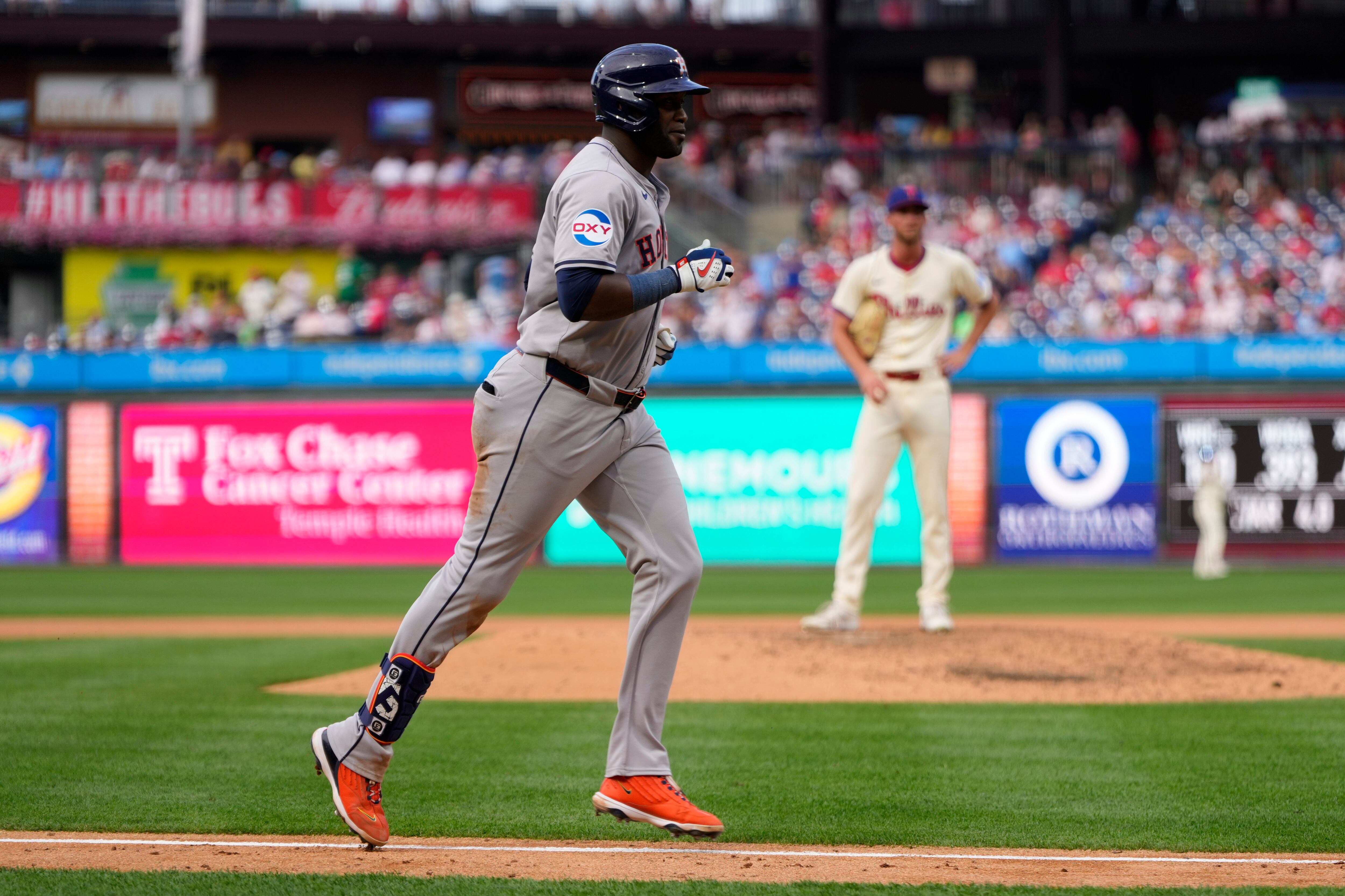El cubano Yordan Álvarez, de los Astros de Houston, trota luego de conseguir un jonrón ante el pitcher Michael Mercado, de los Filis de Filadelfia, el miércoles 28 de agosto de 2024 (AP Foto/Matt Slocum) AP (Matt Slocum/AP)