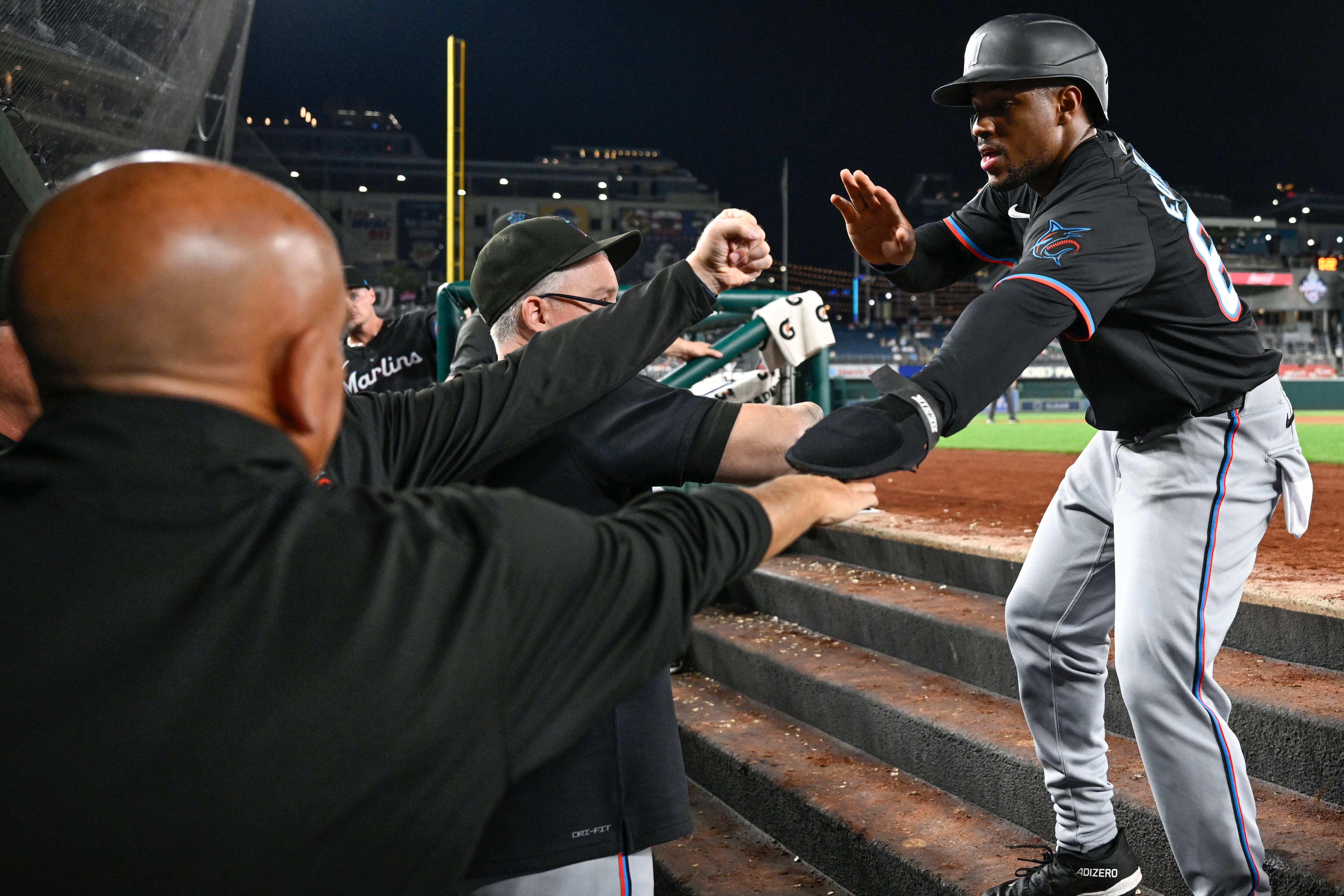 Xavier Edwards, de los Marlins de Miami, vuelve a la cueva luego de anotar ante los Nacionales de Washington, el jueves 12 de septiembre de 2024 (AP Foto/John McDonnell) AP (John McDonnell/AP)
