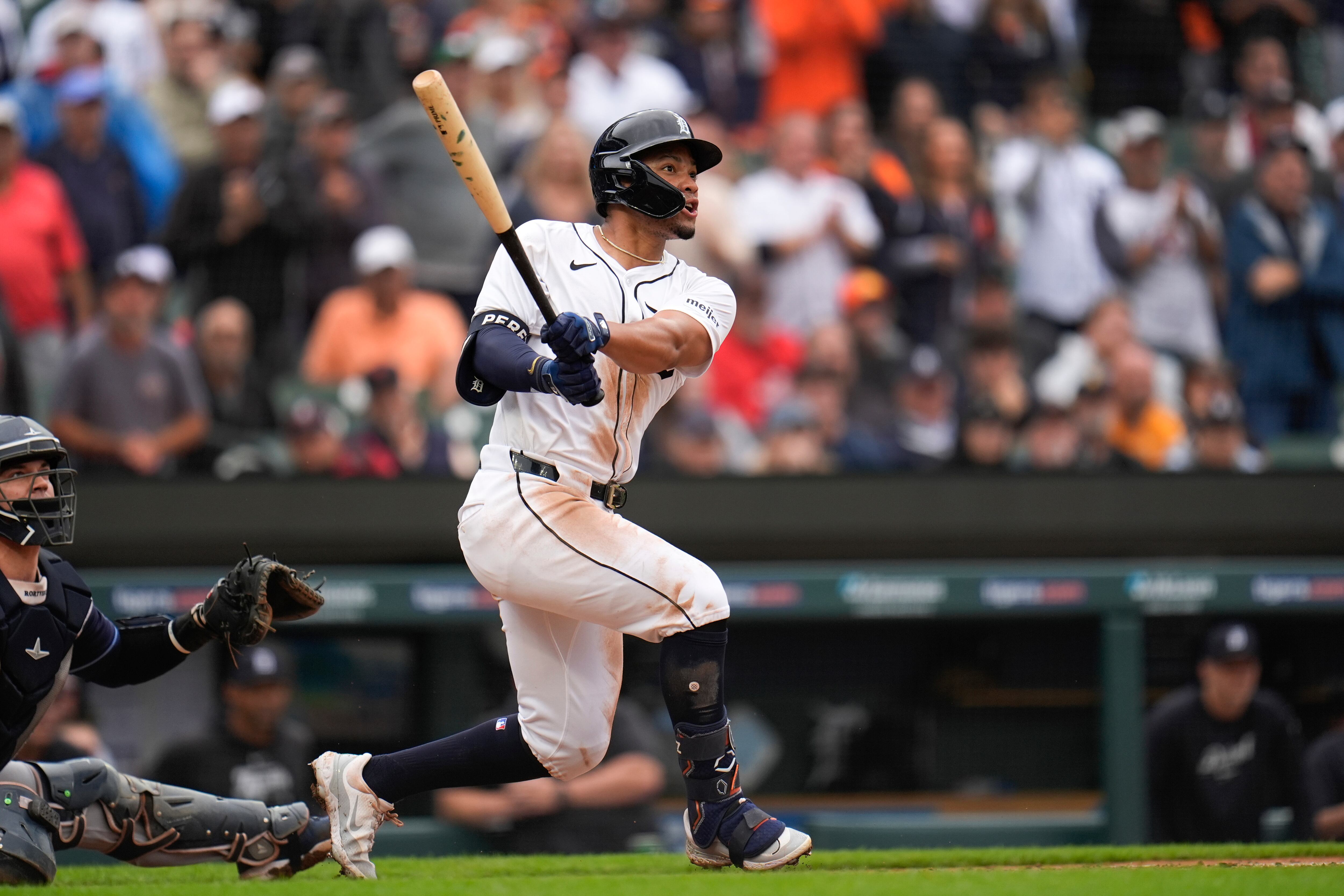 El dominicano Wenceel Pérez se embasó tres veces por Detroit, recibiendo un par de boletos antes de conectar un doblete de dos carreras en el quinto.