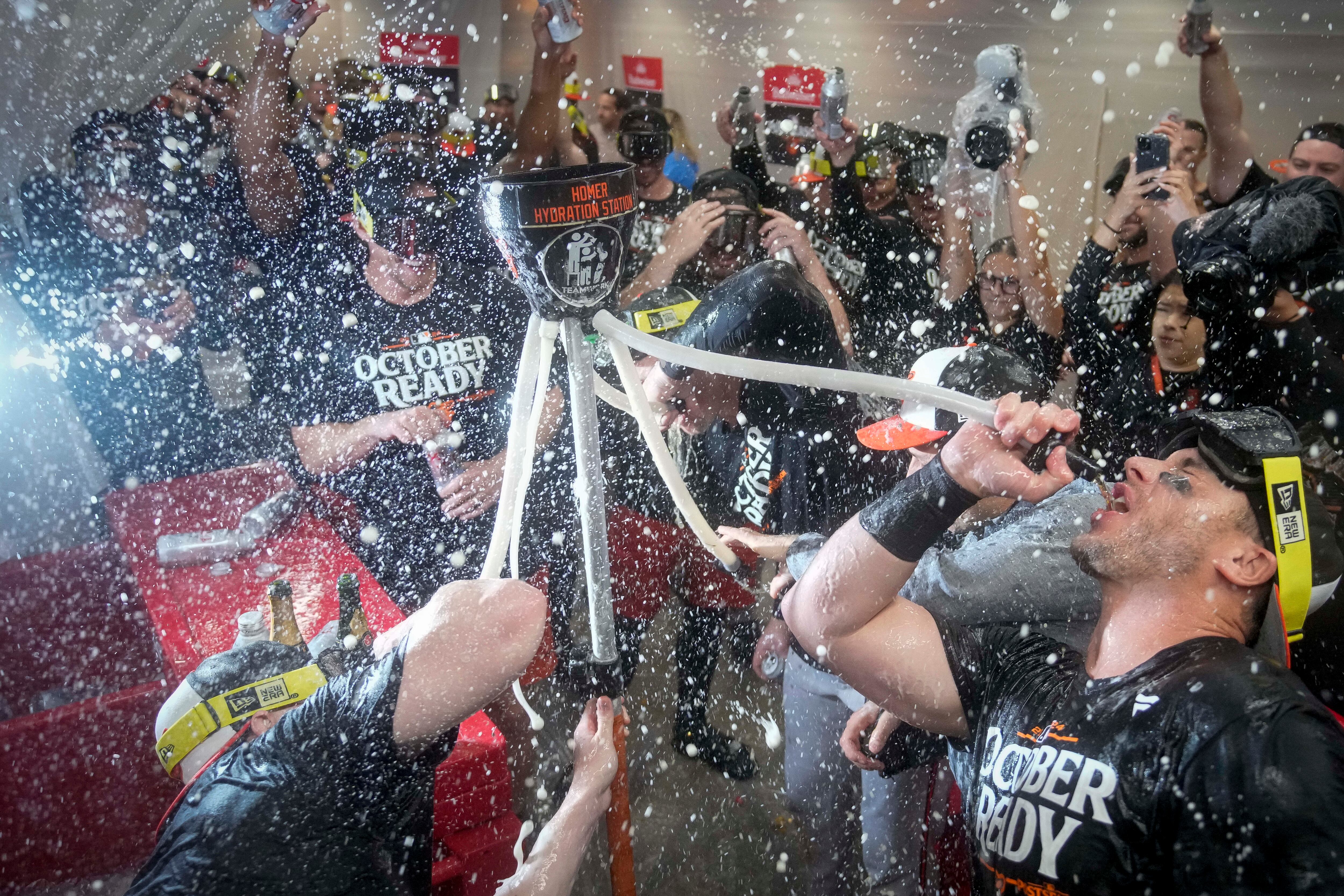 Después de que Cowser atrapó un elevado del mexicano Alex Verdugo para asegurar el triunfo, los Orioles llenaron el clubhouse de los visitantes. El espacio estaba cubierto ya con cortinas de plástico, ante la inminente guerra de champaña.