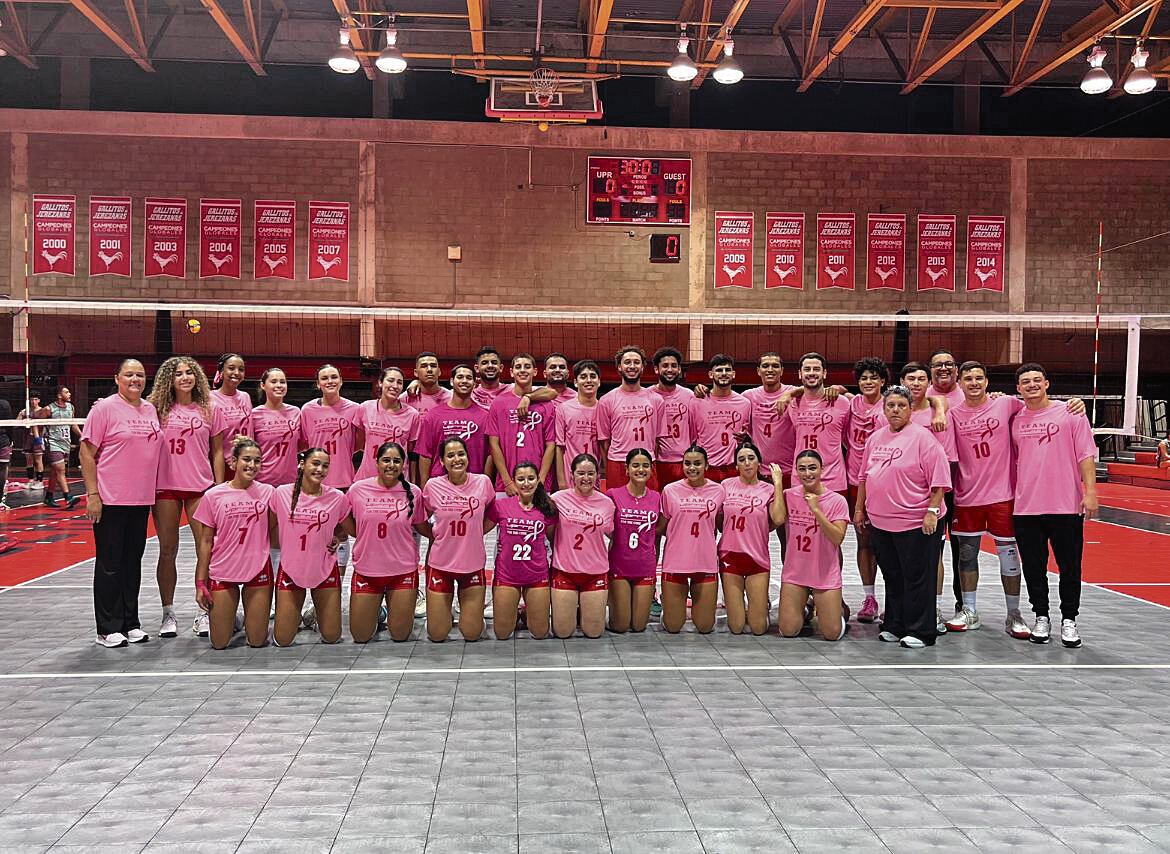 Jugadores y jugadoras de voleibol de la UPRRP visten sus camisas rosas en el mes de octubre.