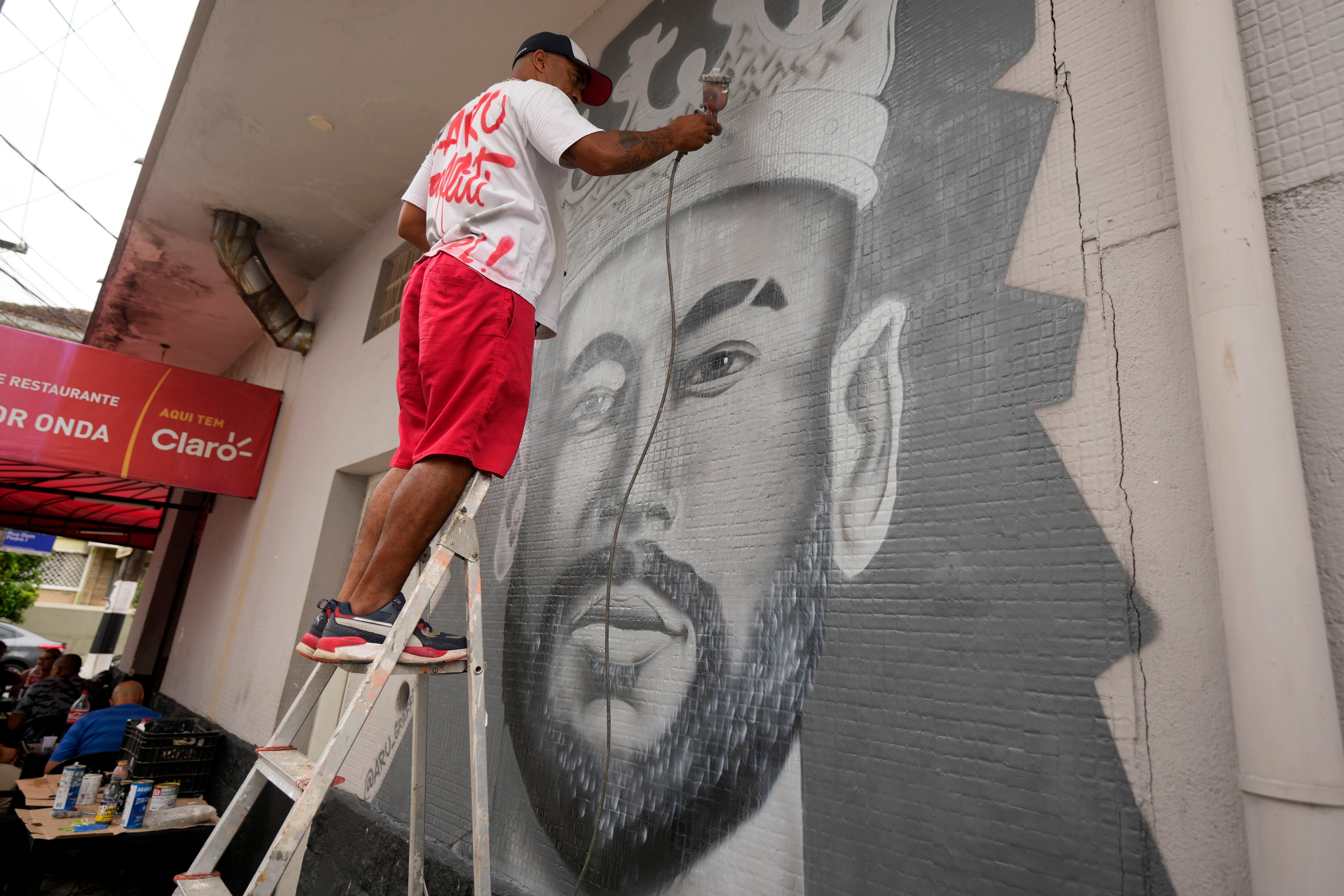 Un grafiti inspirado en inteligencia artificial fuera del estadio mostraba a Neymar luciendo más maduro y con una corona en la cabeza —no es poca cosa en una ciudad donde Pelé fue rey durante décadas hasta que falleció en diciembre de 2022 a los 82 años.
