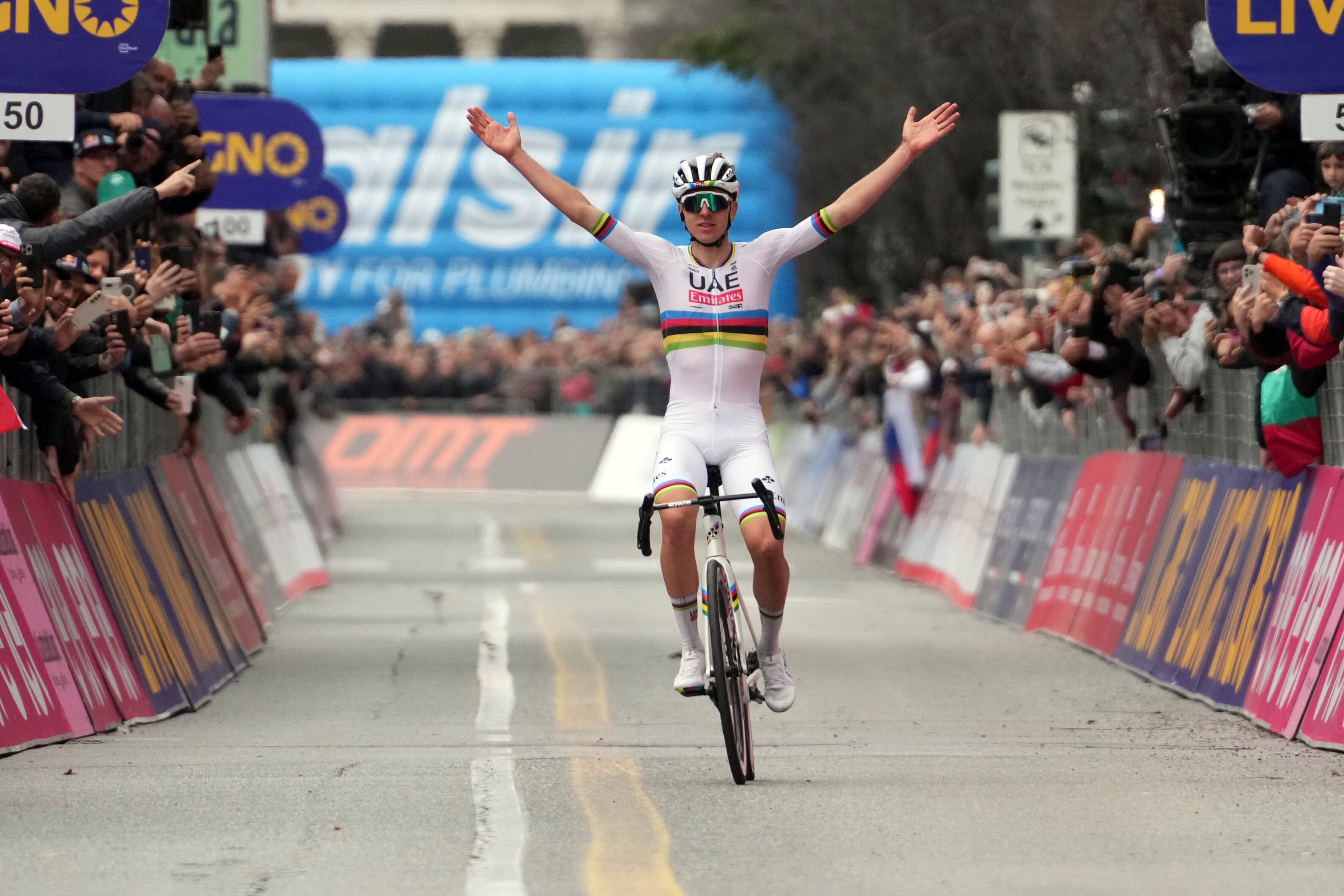 El campeón defensor se recuperó de una fuerte caída para convertirse en el segundo ciclista en ganar las Strade Bianche tres veces.
