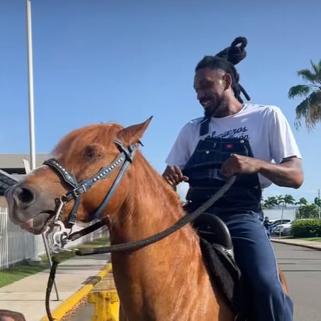 Balkman quien forma parte de la plantilla de los Vaqueros de Bayamón llegó en un caballo al Coliseo Rubén Rodríguez y con la vestimenta que distingue a los verdaderos vaqueros.