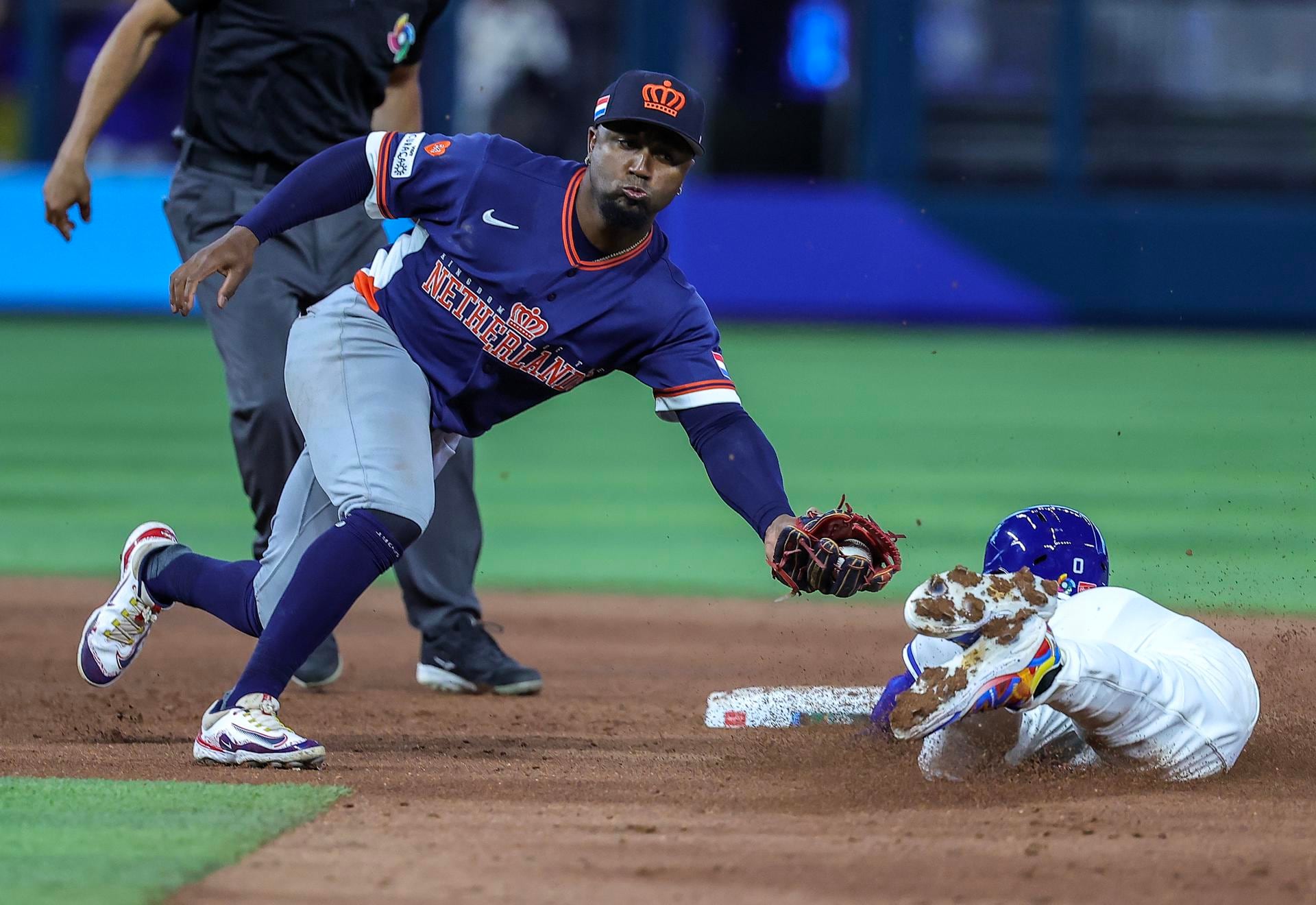 El segunda base de Venezuela, Andrés Giménez, es atrapado robando segunda base por el segunda base de Países Bajos, Ozzie Albies, durante el juego del grupo D del Clásico Mundial de Béisbol 2026 entre Países Bajos y Venezuela en el loanDepot Park en Miami, Florida (EE.UU.). EFE/CRISTOBAL HERRERA-ULASHKEVICH