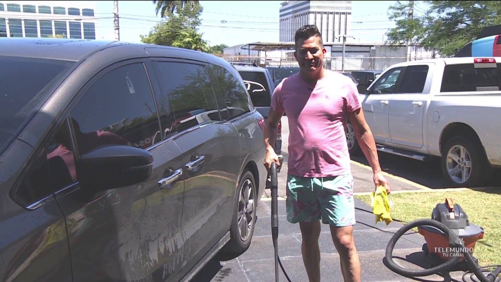 Hoy, según comparte Telemundo, se le vio en cortos, t-shirt y con manguera en mano para dejar brillosa la guagua de la animadora.