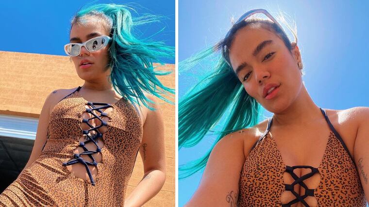 Karol G publicó sugestivas fotografías que acompañó con el siguiente mensaje: “Ok… llegó la hora 🥺💖 mañana los quiero ver con un look bien Chimba, list@s pa conseguir novi@, que se les marque el pantysito Moschino, readys pa quedar sin voz y CON EL PELO AZUL!!!! COACHELLA ⭐️⭐️⭐️⭐️⭐️ LLEGÓ LA BICHOTAAAAAAAAA HPTAAAA!!!”.