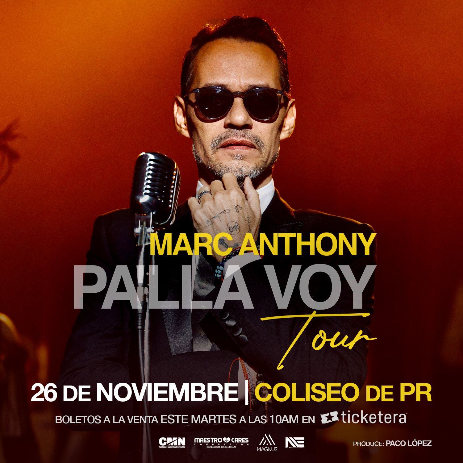 El productor Paco López anunció hoy, vierens, que la venta de boletos para el concierto de Marc Anthony, que forma parte de la gira “Pa’lla Voy”, comienza el próximo martes, 3 de de mayo, a las 10:00 de la mañana.