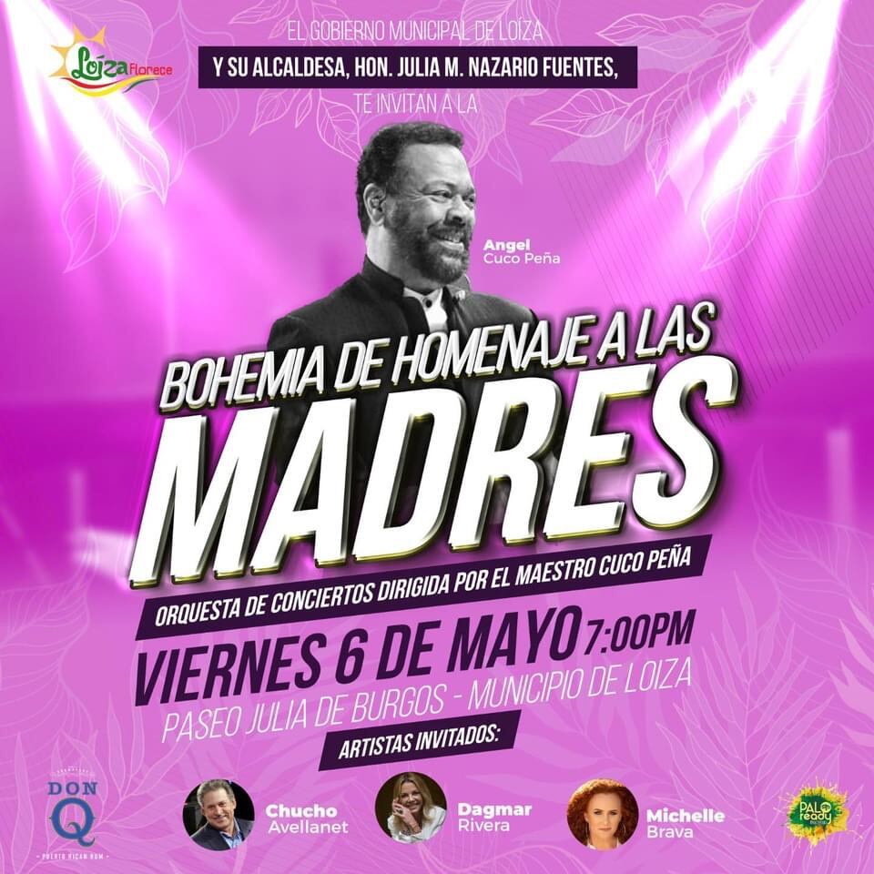 La alcaldesa de Loíza, Julia Nazario Fuentes, anunció la celebración de una Bohemia a las Madres a celebrarse este viernes, a las 7:00 de la noche en el Paseo Julia de Burgos, en el centro urbano de Loíza. “Todas las madres y sus familias están invitadas a esta noche magnífica. Vamos a recibir a los creadores de las bohemias más exquisitas: Cucco Peña, Chucho Avellanet, Dagmar y Michelle Brava”, señaló Nazario Fuentes.