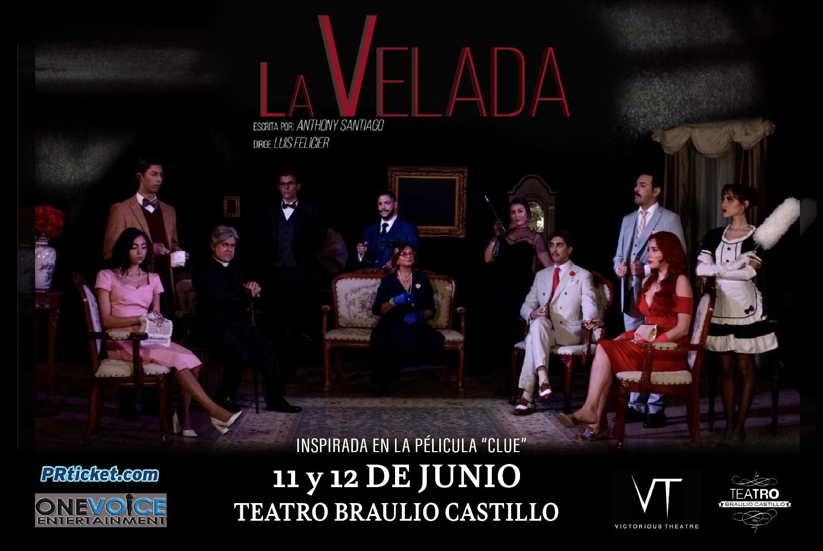 La pieza que está inspirada en la película “Clue”, se presentará los días 11 y 12 de junio en el Teatro Braulio Castillo en Bayamón y contará con las actuaciones de César De León, Michelle Álvarez, Gabriel Villafañe, Alanis Manzano, Anthony Santiago, Stephanie Rivera, Joel Berrios, Melanie Flores, Luis Colón, Luis Merced, Alejandro Márquez, Willanys Pagan, Luz Guadarrama y Kimberly Navarro. La dirección estará a cargo de Luis Felicier.