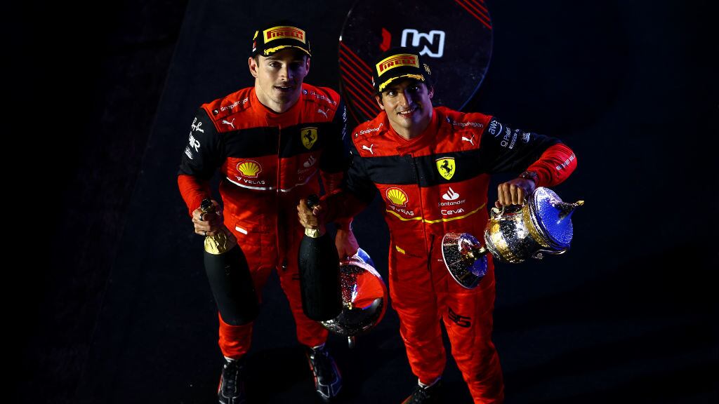 F1 Grand Prix of Bahrain BAHRAIN, BAHRAIN - MARCH 20: Race winner Charles Leclerc of Monaco and Ferrari and Second placed Carlos Sainz of Spain and Ferrari celebrate on the podium during the F1 Grand Prix of Bahrain at Bahrain International Circuit on March 20, 2022 in Bahrain, Bahrain. (Photo by Mark Thompson/Getty Images) (Mark Thompson/Getty Images)