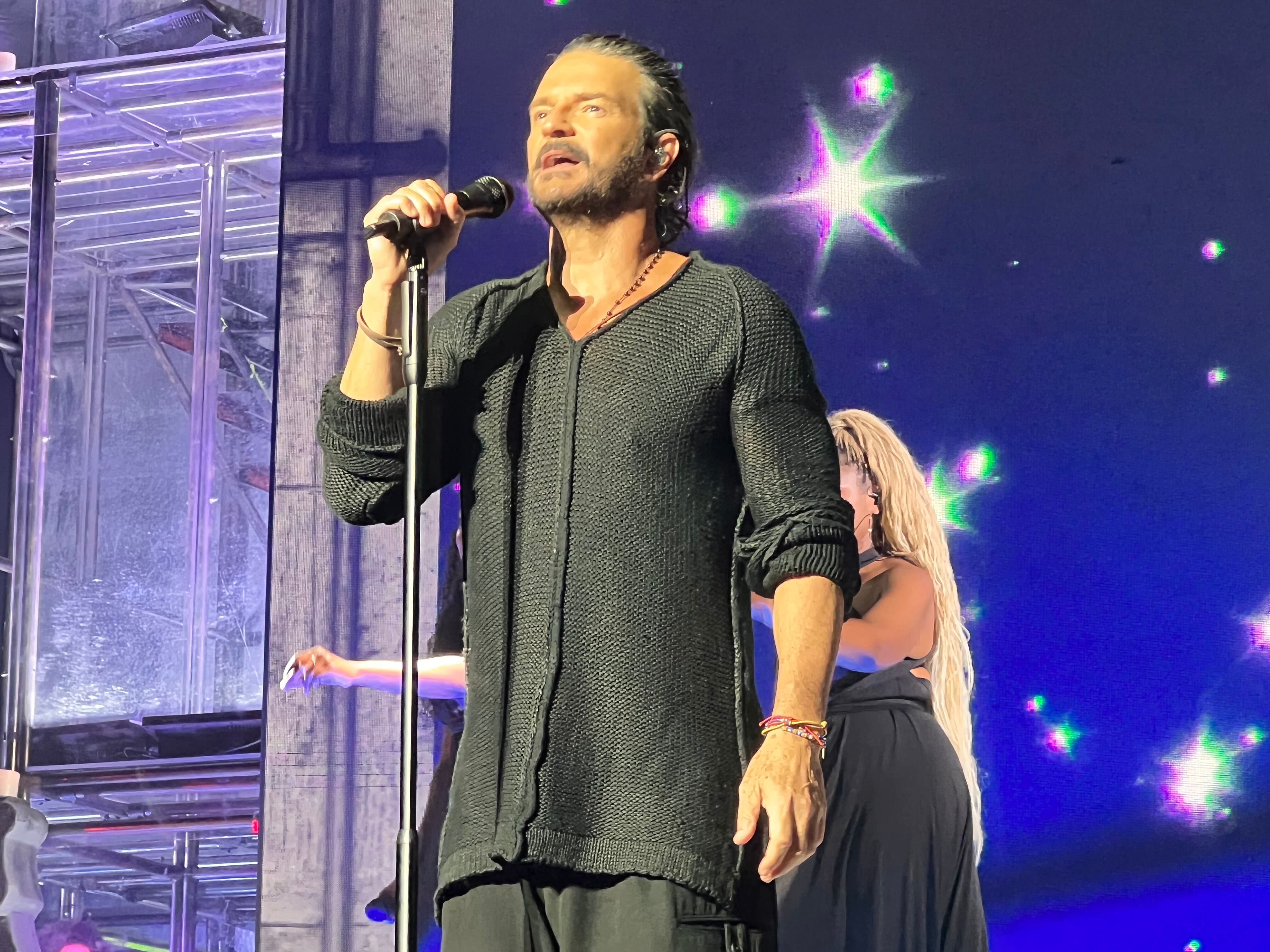 “Puerto Rico buenas noches. De verdad verdad es una bendición para mí volver. El estar aquí es una celebración. Además tengo claro que para nadie ha sido fácil volver. El reencuentro ha sido complicado. Han pasado muchas cosas desde que no nos vemos. Primero nos encerraron casi un año, nos pusieron mascarillas, y nos dejaron ahí con celulares, redes sociales, y nos pusieron creativos y se empezó a ‘jorobar’ la cosa’”, fueron sus primeras expresiones para saludar a la audiencia, previo a interpretar la canción “Hongos”, incluida en el álbum Blanco y Negro.