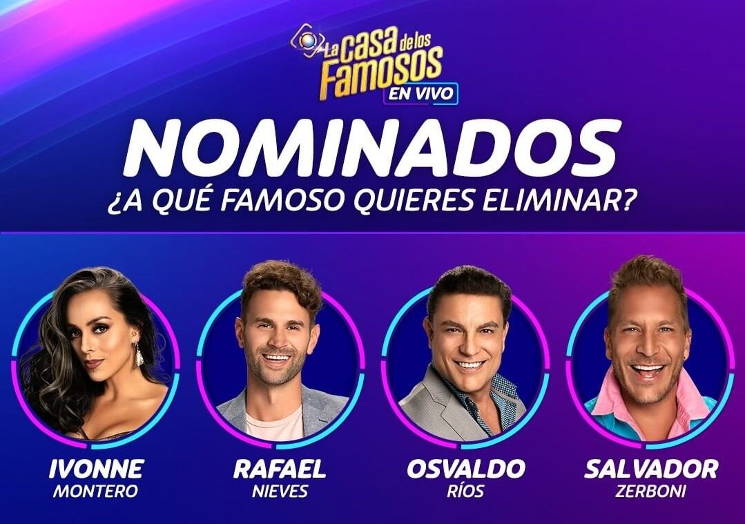 Para esta semana, los nominados a eliminar son: Ivonne Montero, Rafael Nieves, Osvaldo Ríos y Salvador Zerboni.