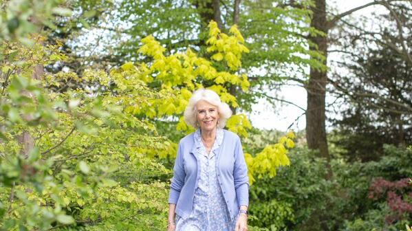 Otra de las imágenes oficiales, muestra a la duquesa de Cornualles vestida con un traje azul con estampado floreado de la diseñadora Sophie Dundas. A Camila se le ve sonriente y disfrutando de una taza de té en su jardín.