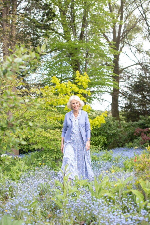 Otra de las imágenes oficiales, muestra a la duquesa de Cornualles vestida con un traje azul con estampado floreado de la diseñadora Sophie Dundas. A Camila se le ve sonriente y disfrutando de una taza de té en su jardín.