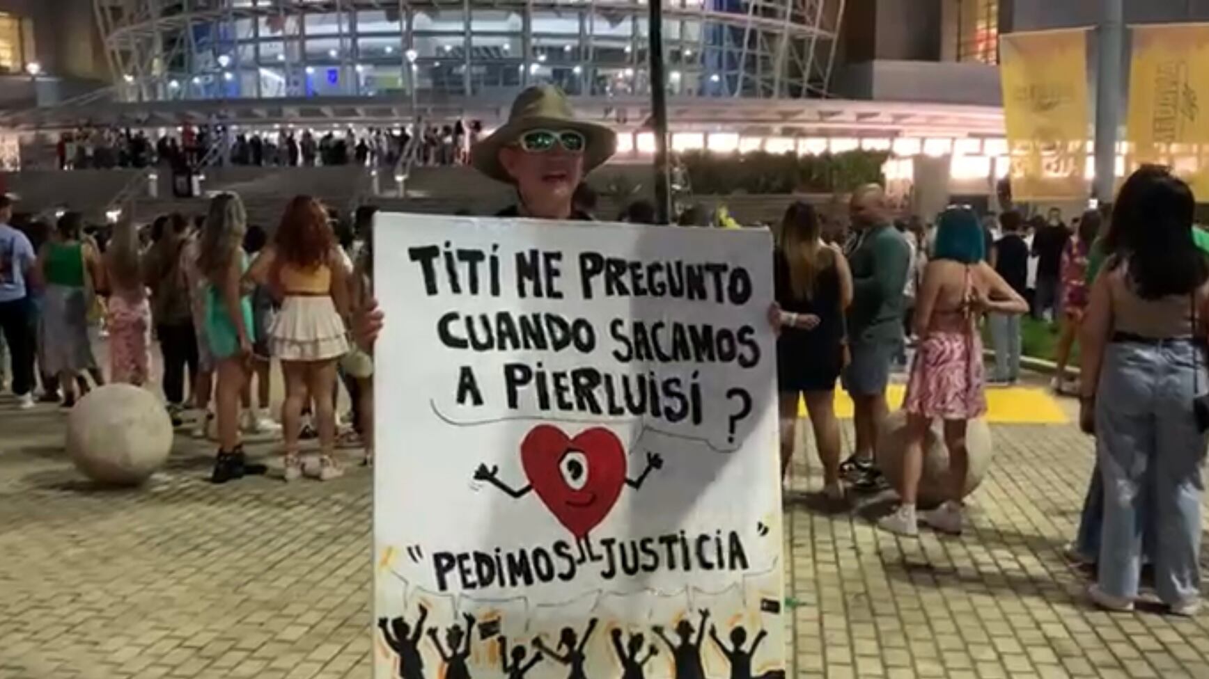 En medio de las largas filas que esparaban entrar al Choli para el gran evento estaba José, un residente de Bayamón que se instaló en las afueras del venue principal con una pancarta alusiva al último disco de Bad Bunny, con el ya icónico diseño del corazón rojo y una frase en referencia a la conocida canción “Titi me preguntó” pero con un claro mensaje social. “Titi me preguntó, ¿cuándo sacamos a Pierluisi? … Pedimos justicia”, leía el cartel con el que muchos fanáticos del trapero paraban a tirarse fotos.