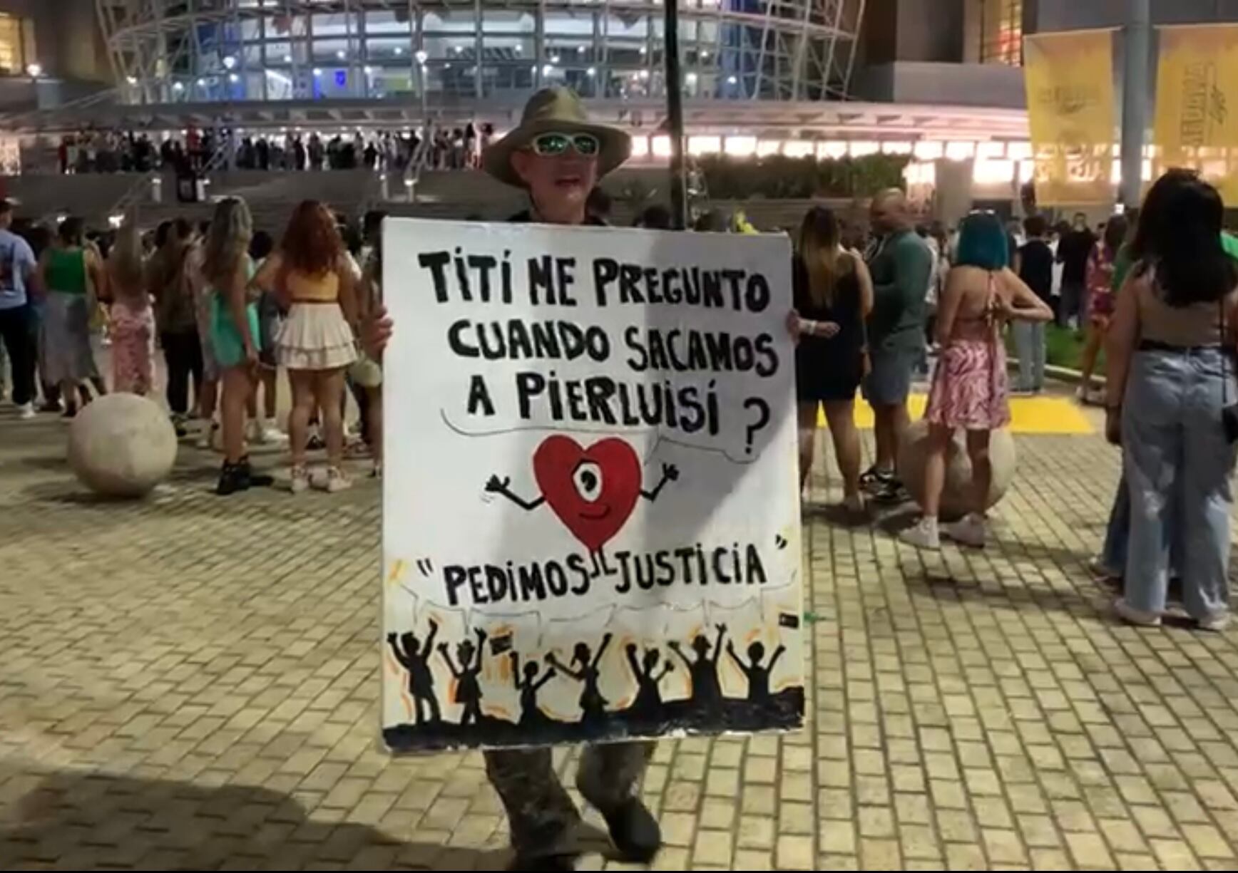 En medio de las largas filas que esparaban entrar al Choli para el gran evento estaba José, un residente de Bayamón que se instaló en las afueras del venue principal con una pancarta alusiva al último disco de Bad Bunny, con el ya icónico diseño del corazón rojo y una frase en referencia a la conocida canción “Titi me preguntó” pero con un claro mensaje social. “Titi me preguntó, ¿cuándo sacamos a Pierluisi? … Pedimos justicia”, leía el cartel con el que muchos fanáticos del trapero paraban a tirarse fotos.