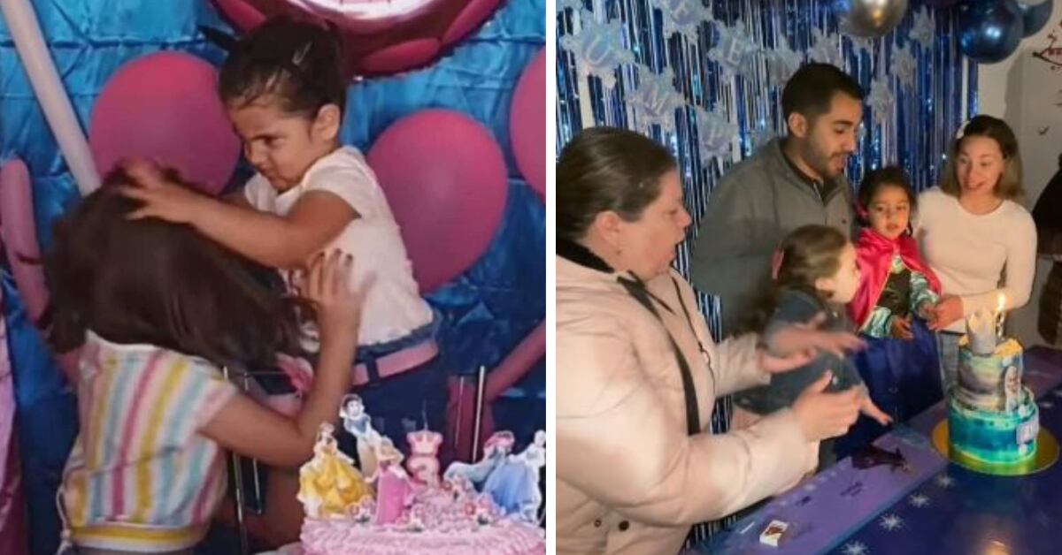 La niña intentó soplar la vela, sin embargo su madre la detuvo, mientras que la cumpleañera la apagó. En ese momento, la pequeña se molestó por no alcanzar a soplar y empezó a gritar intensamente.