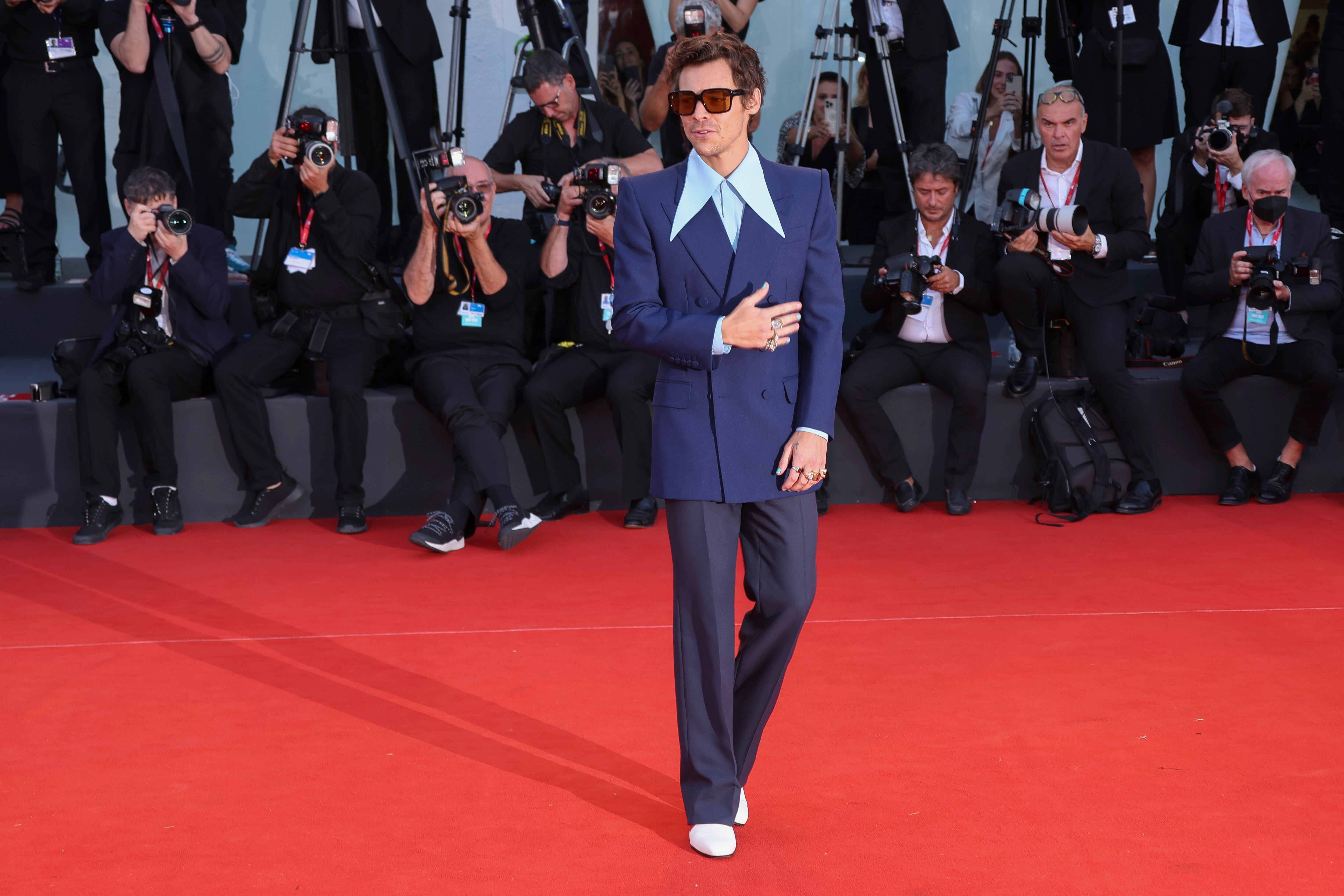 Styles llegó con todo a la alfombra roja de Venecia luciendo un traje azul marino de Gucci con hombreras y una camisa de solapa muy grande, dijo la editora ejecutiva digital de Harper’s Bazaar Sarah Karmali a The Associated Press.