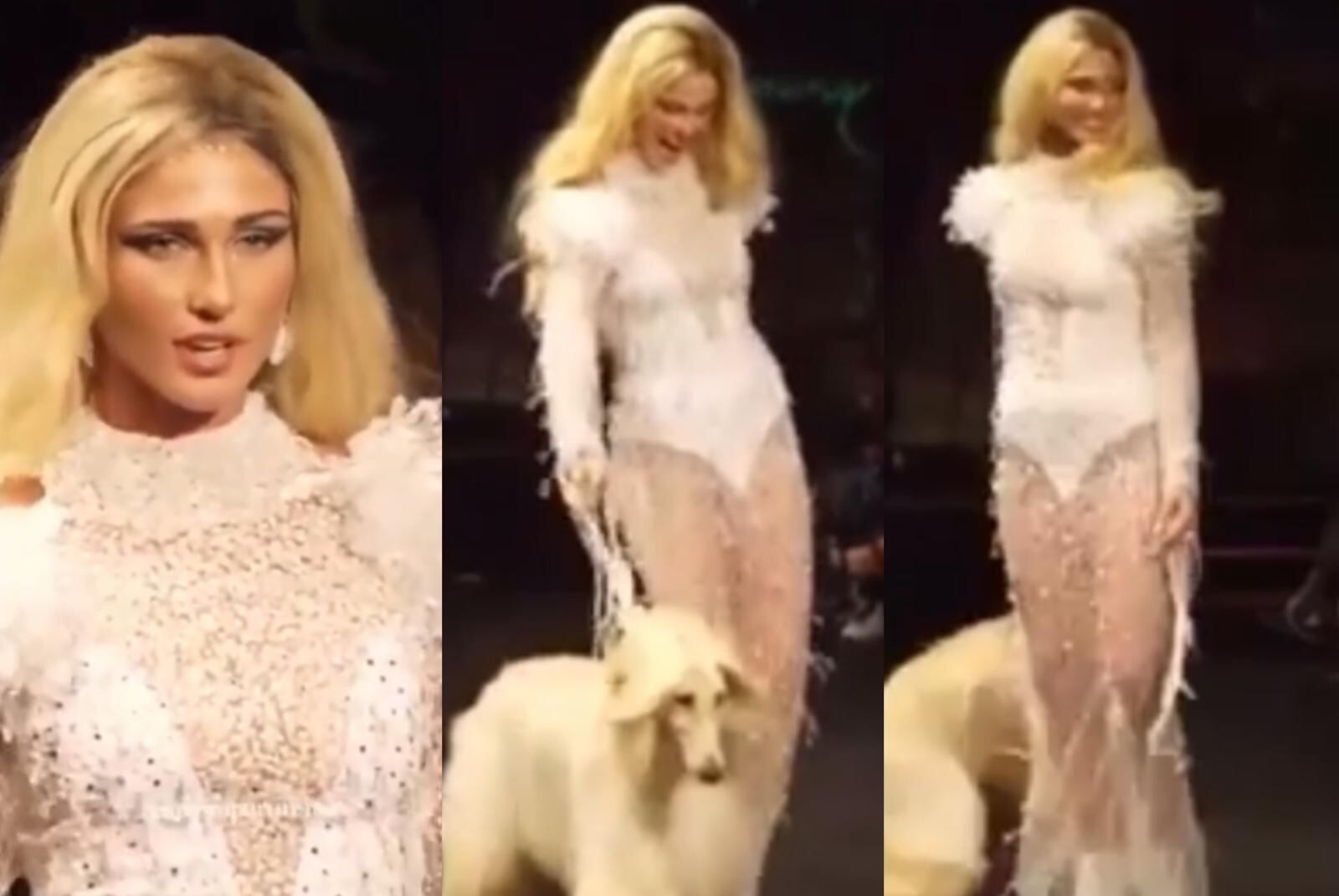 En su presentación, la también modelo y cantante tropezó varias veces mientras modelaba con un juguetón perro, de la raza lebrel afgano, que a juzgar por los vídeos colgados en Internet no le seguía su paso.