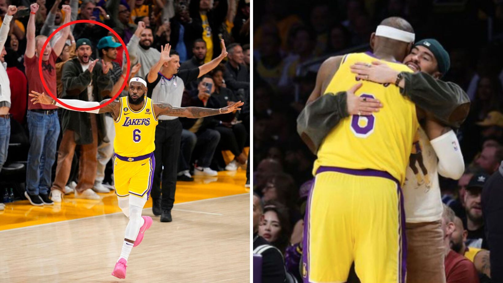 A través de varias fotografías publicadas en las redes sociales se puede ver a Benito Antonio Martínez Ocasio disfrutando del partido de los Lakers frente al Oklahoma City Thunder en primera fila. Incluso el boricua y la estrella de la NBA se confundieron en un abrazo previo a iniciar el partido. Hay que recordar que estos se conocen y han compartido en diversos proyectos. LeBron James ha estado de visita en Puerto Rico donde también ha compartido con Bad Bunny.