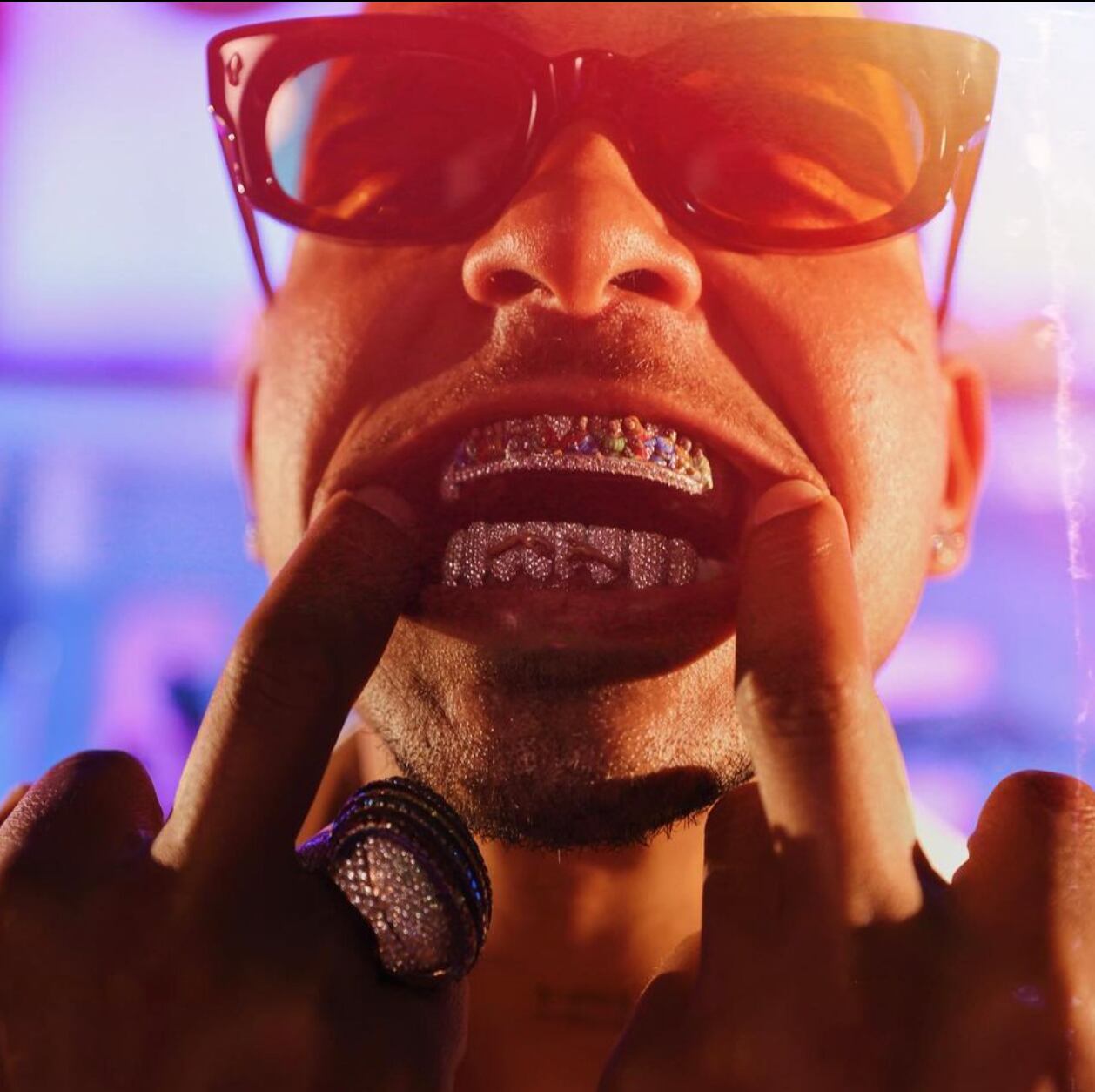 En la imagen, se ve al intérprete de música urbana estrenando un par de “grillz”, cubiertas de boca decorativas que a menudo son hechas de oro, plata o metales.