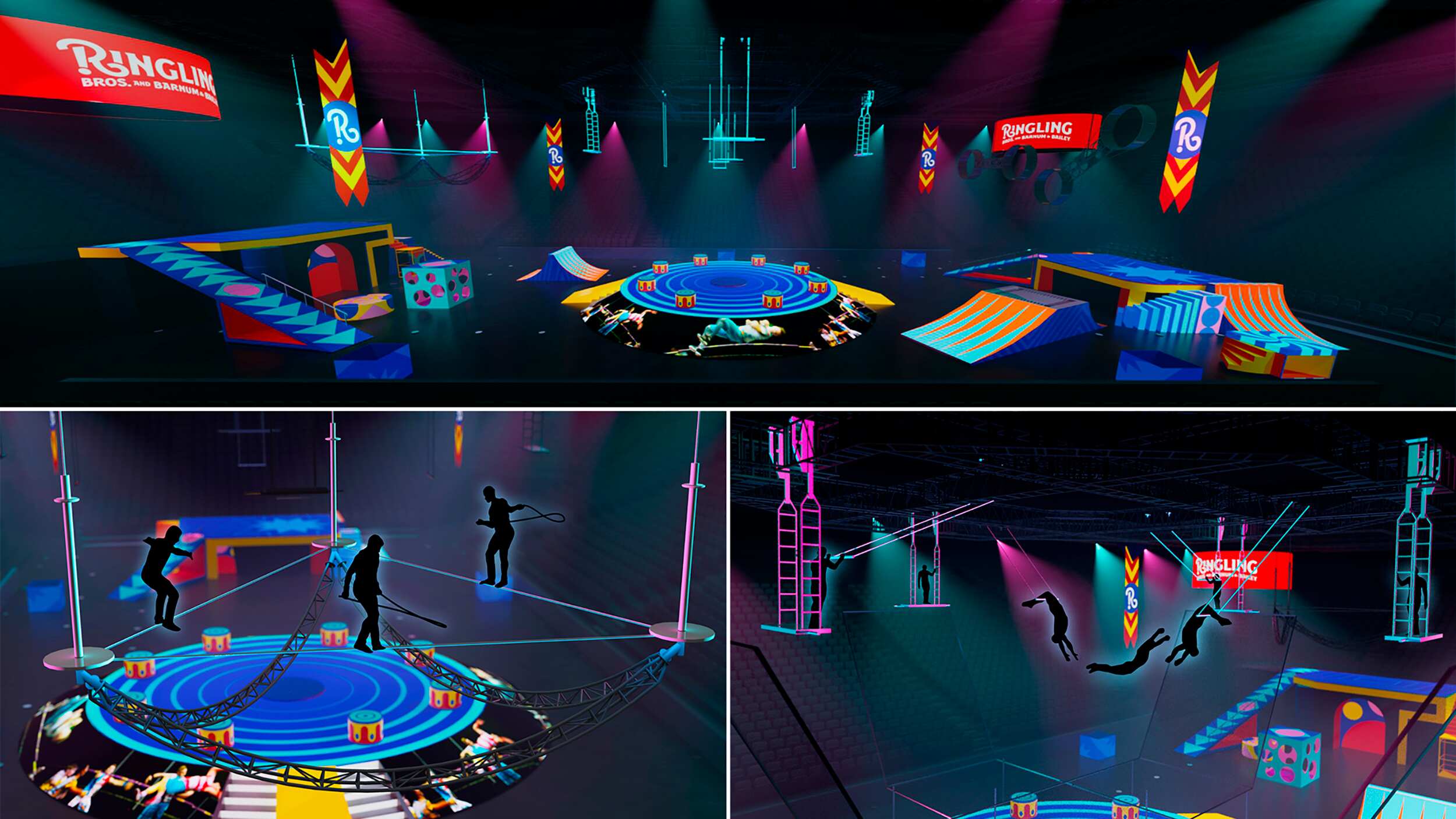En esta combinación de fotografías, imágenes creadas por computadora del nuevo espectáculo del circo Ringling Bros. and Barnum & Bailey, que se presentará sin animales. El circo comenzará a finales de año su gira por Norteamérica con trapecistas, AP (AP)