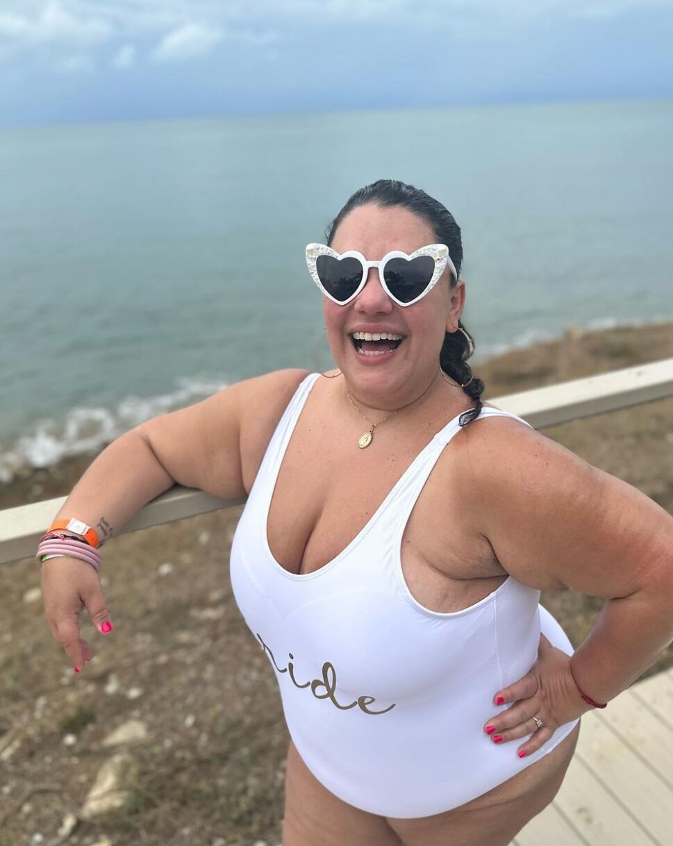 Fragoso, quien se comprometió a finales de 2022 con José Rivas, vistió un traje de baño de color blanco con la palabra “bride (novia)”.