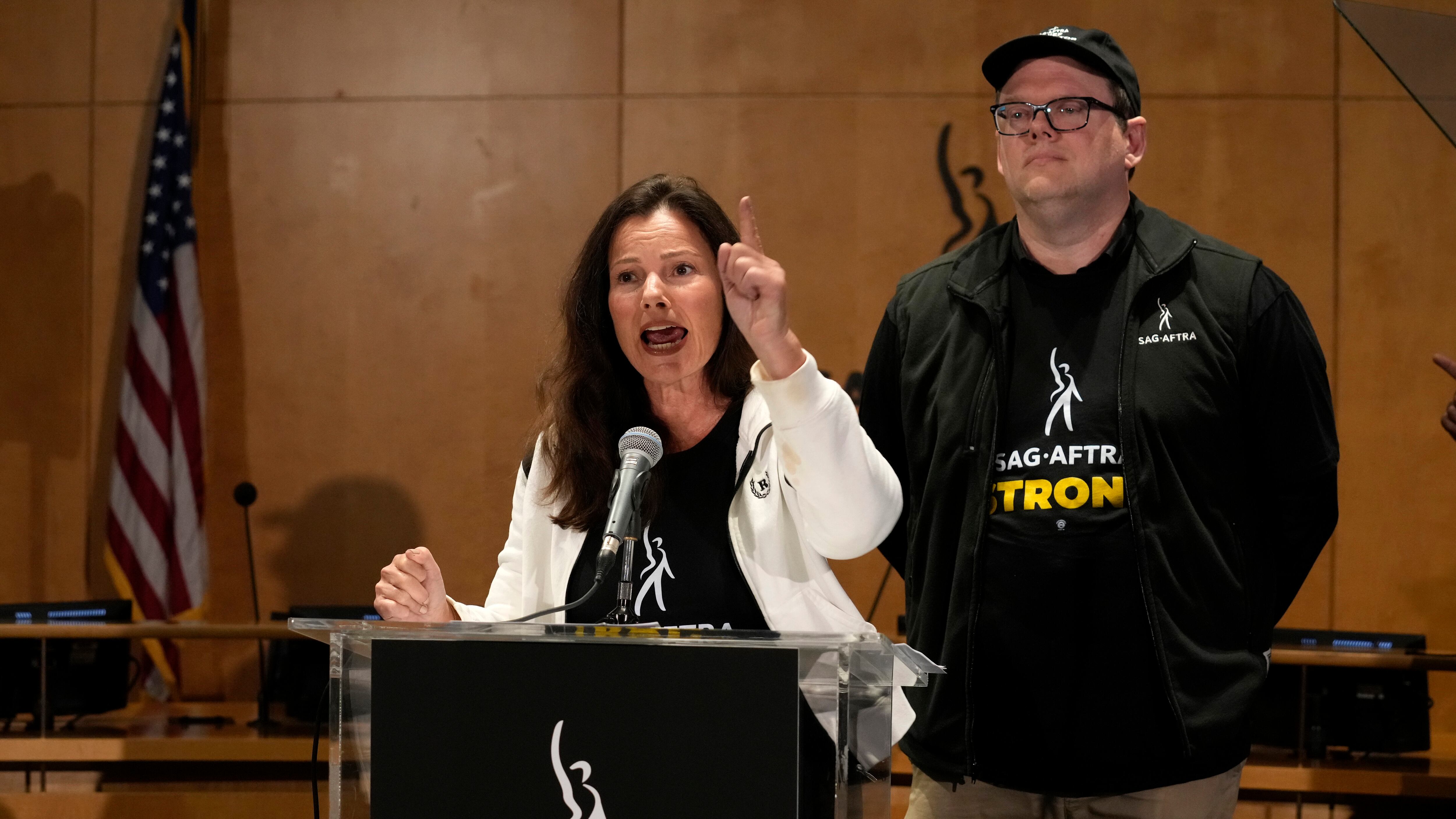La presidenta de SAG-AFTRA, Fran Drescher, a la izquierda, y el director ejecutivo nacional y negociador en jefe de SAG-AFTRA, Duncan Crabtree-Ireland, hablan durante una conferencia de prensa que anuncia una huelga del Sindicato de Actores de la Pantalla AP (Chris Pizzello/Chris Pizzello/Invision/AP)