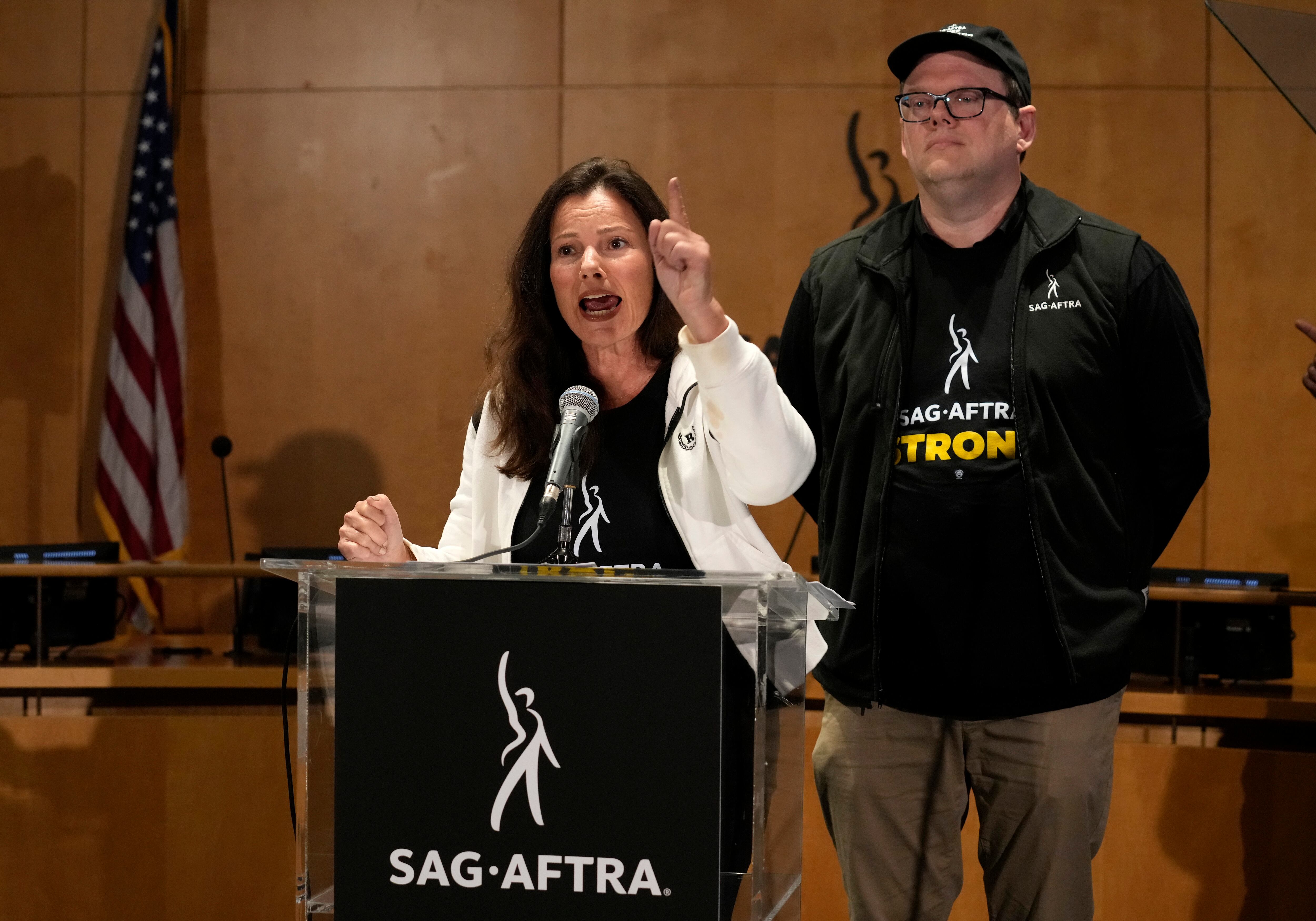 La presidenta de SAG-AFTRA, Fran Drescher, a la izquierda, y el director ejecutivo nacional y negociador en jefe de SAG-AFTRA, Duncan Crabtree-Ireland, hablan durante una conferencia de prensa que anuncia una huelga del Sindicato de Actores de la Pantalla AP (Chris Pizzello/Chris Pizzello/Invision/AP)