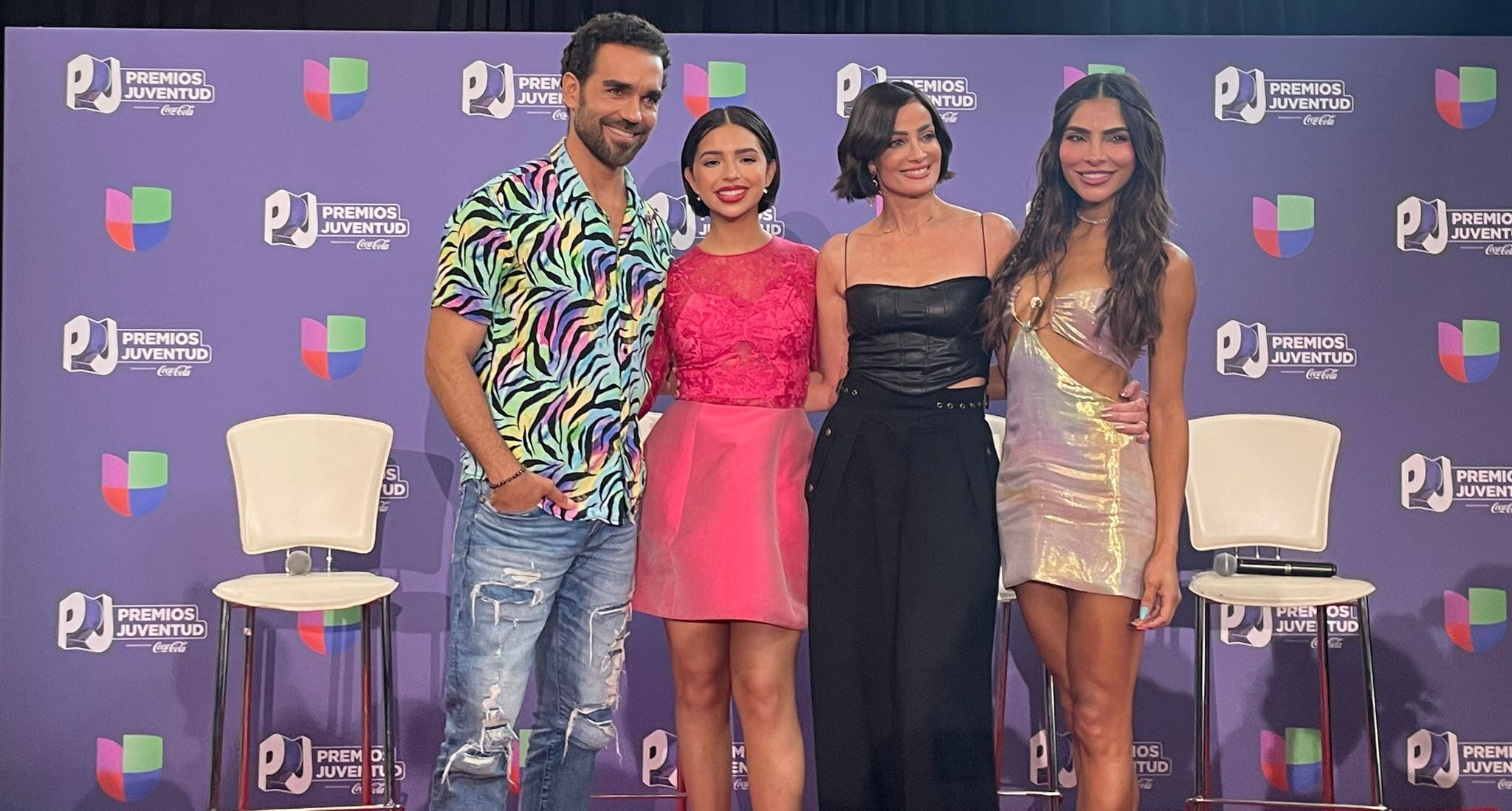 Los presentadores de Premios Juventud Alejandra Espinoza, Marcus Ornella, Ángela Aguilar y Dayanara Torres se mostraron entusiasmados y listos para sentir el calor de la audiencia puertorriqueña mañana, jueves, en el Coliseo de Puerto Rico.