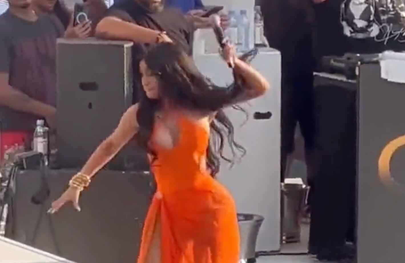 El video muestra a Cardi B actuando en el escenario cuando de repente se le arroja una bebida desde la primera fila de la multitud. En respuesta, la cantante reaccionó rápidamente y lanzó su micrófono hacia la fanática que le había arrojado la bebida.