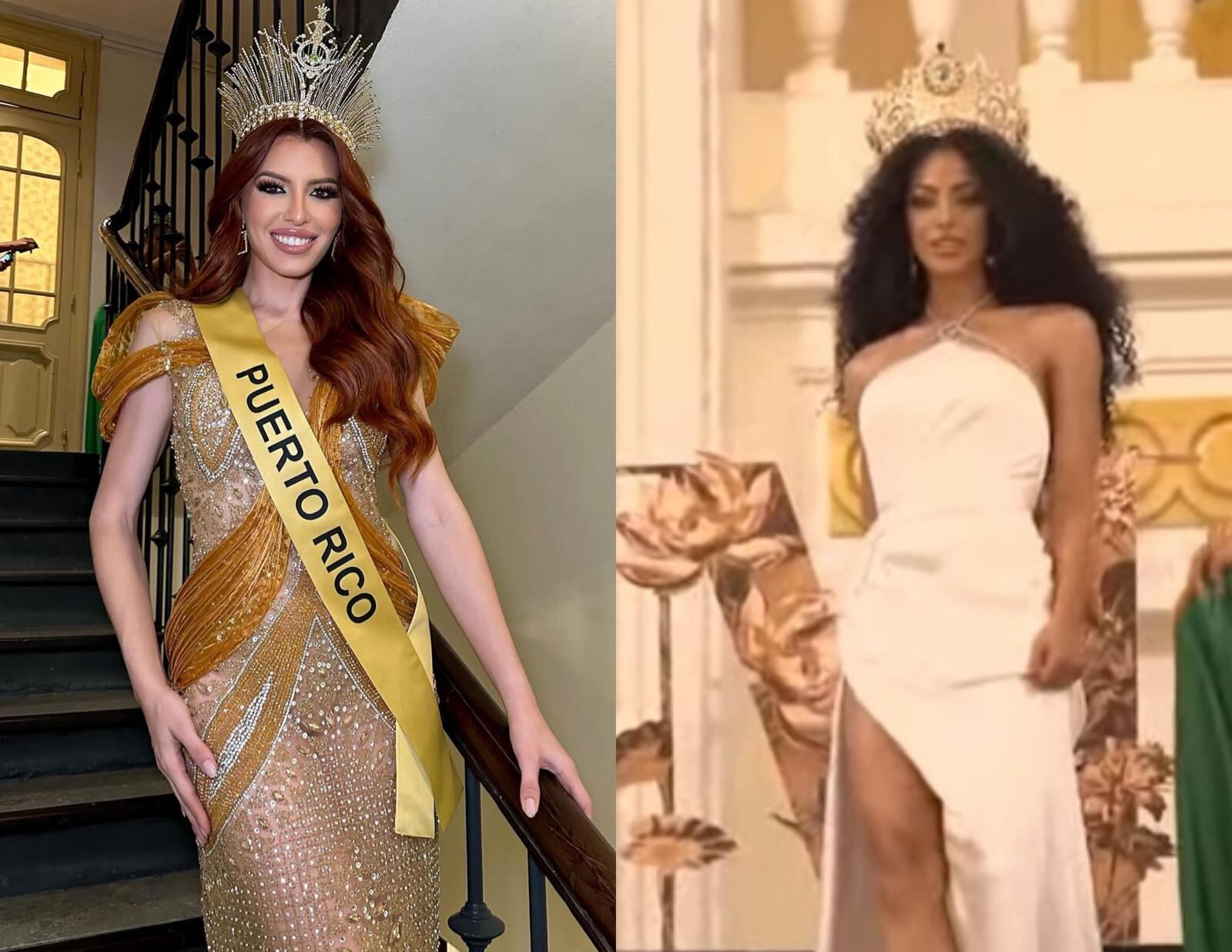 La representante de Puerto Rico lució un espectacular vestido con tonalidades doradas, mientras la estadounidense-boricua llevó un sencillo pero elegante traje blanco.