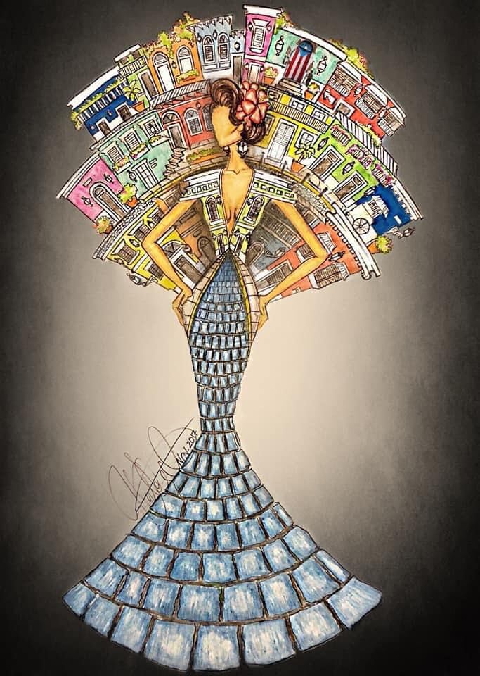 La falda, elaborada en terciopelo y lentejuelas negras en un elegante corte trompeta, está adornada con cientos de adoquines hechos a mano, cada uno pintado para replicar los icónicos adoquines azules del Viejo San Juan. Sobre el corset, que emula la arquitectura de la Fortaleza, se despliega un espaldar tipo concha adornado con más de una docena de lugares emblemáticos del Viejo San Juan, desde la fuente del Paseo de la Princesa hasta la capilla del Santo Cristo, todo en impresionantes detalles en 3D, algunos iluminados con luces LED.