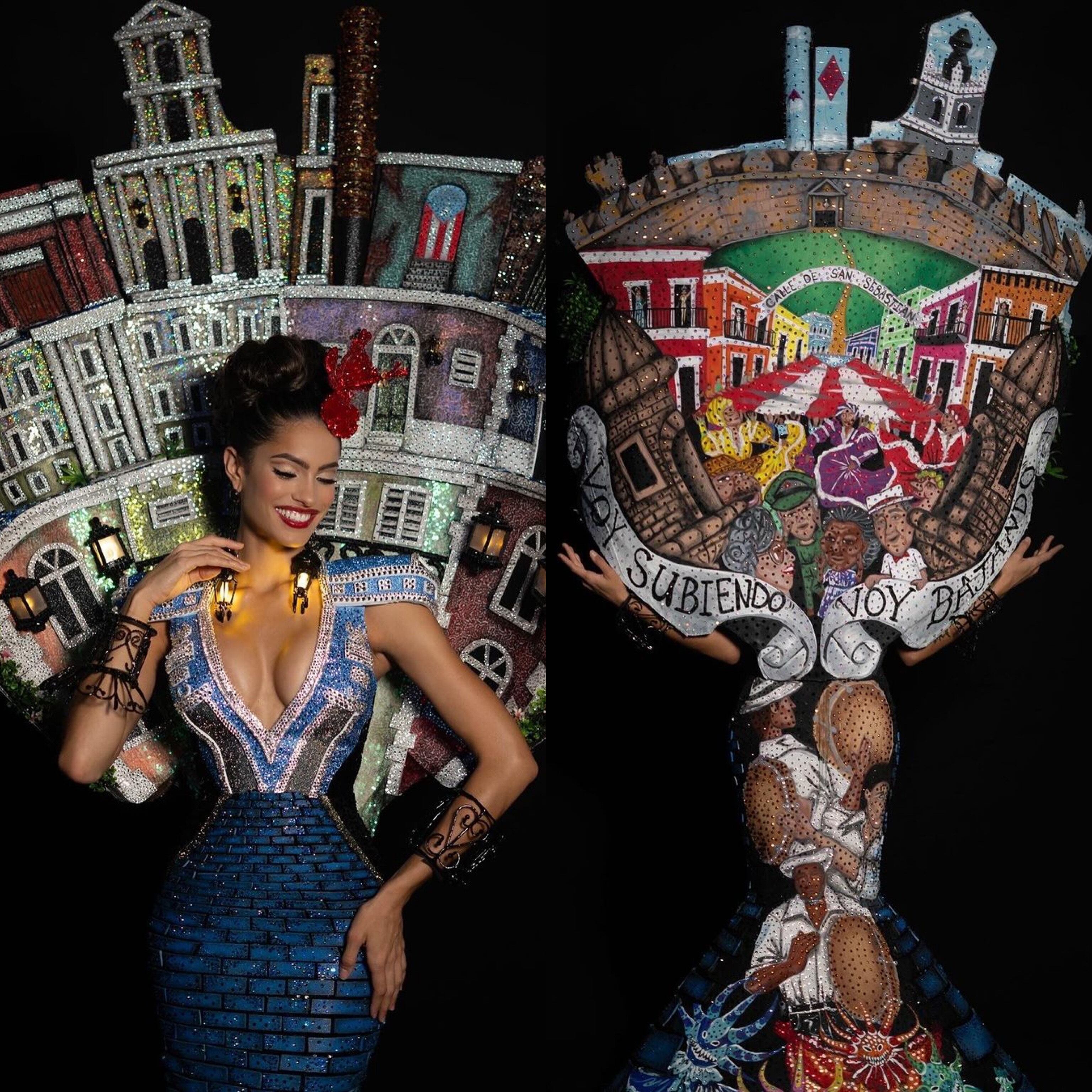 En la parte posterior del vestuario, una pintura a mano ofrece una vista panorámica del Castillo San Felipe del Morro, los cabezudos, vejigantes, pleneros y bailarines folclóricos que danzan sobre la multitud festiva, con la bandera Monoestrellada ondeando en lo alto. Un detalle especial es que las cinco reinas universales puertorriqueñas y otras personalidades icónicas del país se destacan en la pintura. La totalidad del traje está meticulosamente recamada en cristales de diversos colores, agregando un toque de brillo y encanto a esta obra maestra.