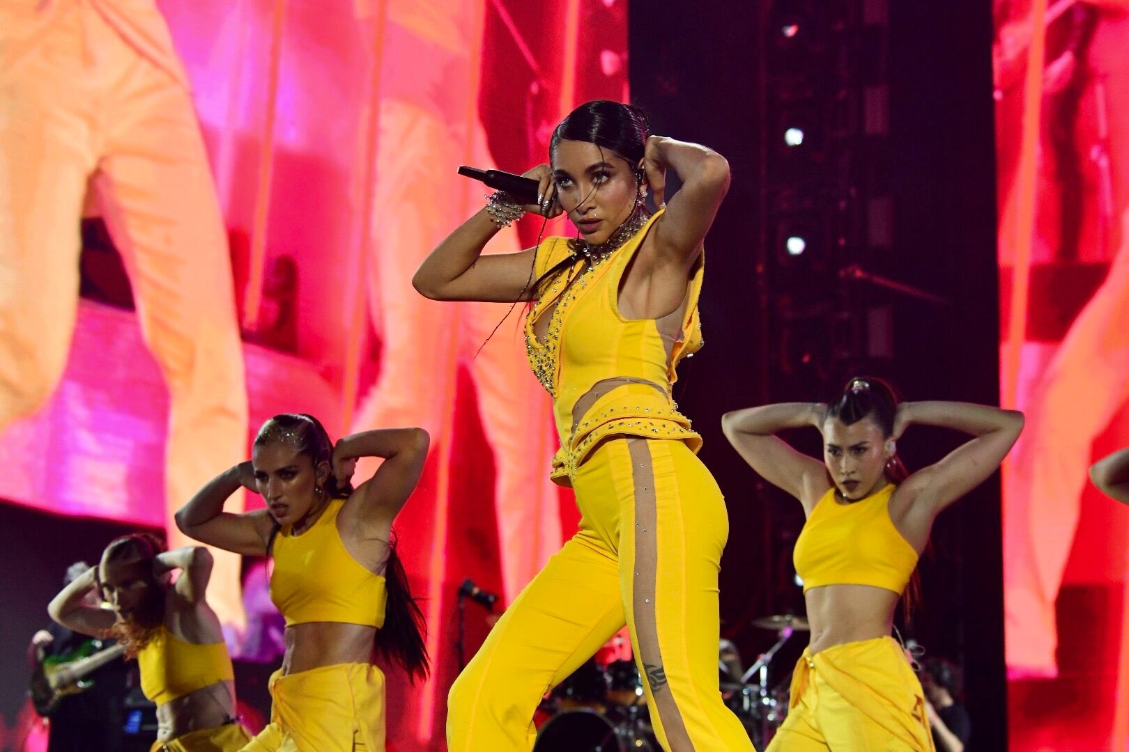 Otro de los bloques de la presentación inició con “Piscina”, canción en la que el puertorriqueño Chencho Corleone, colabora con la argentina. Sin embargo, no hubo artistas invitados para las canciones que han sido colaboraciones, más bien los coristas de la banda hicieron las partes de estas colaboraciones. El coro para el concierto fue de siete voces.