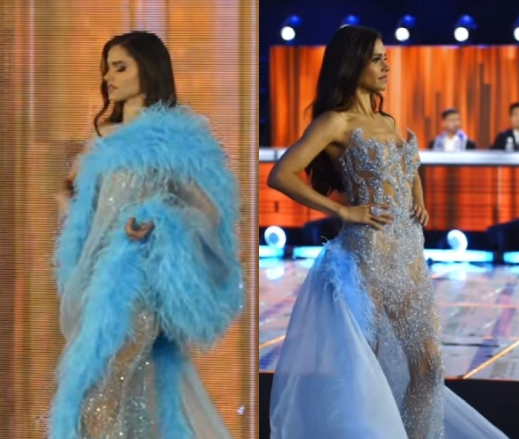 La beldad boricua, quien es hija del conocido productor Angelo Medina, usó una pieza brillante, con transparencias y plumas confeccionada por el diseñador José Karlo.