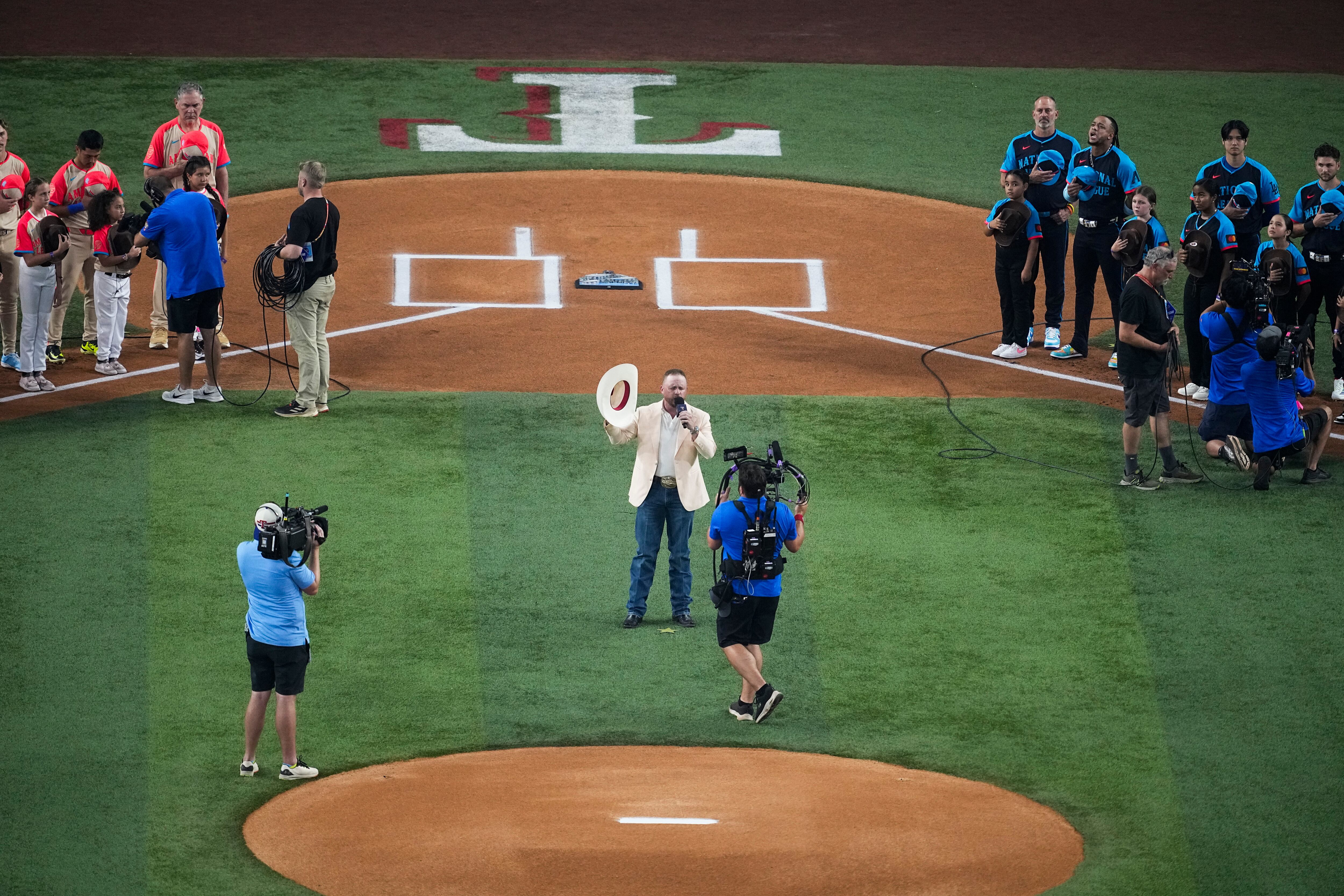 Johnson había hecho ya el lanzamiento ceremonial de la primera bola en el Globe Life Field esta temporada, antes de recibir la misión de cantar el himno.