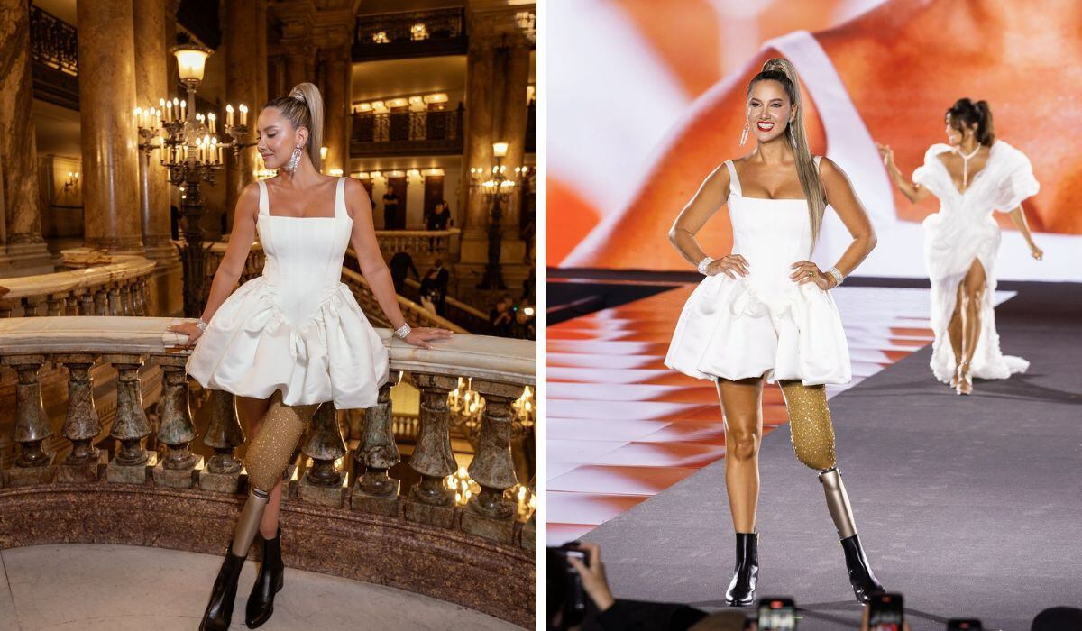 Durante el evento de L’Oréal, Daniella se destacó al utilizar su prótesis de pierna, mostrando su increíble fortaleza. La modelo lució un vestido blanco de corte globo, con tirantes y un escote recto que complementó con botines negros, creando un look sofisticado. Su cabello, peinado en una elegante cola de caballo, realzó su figura.