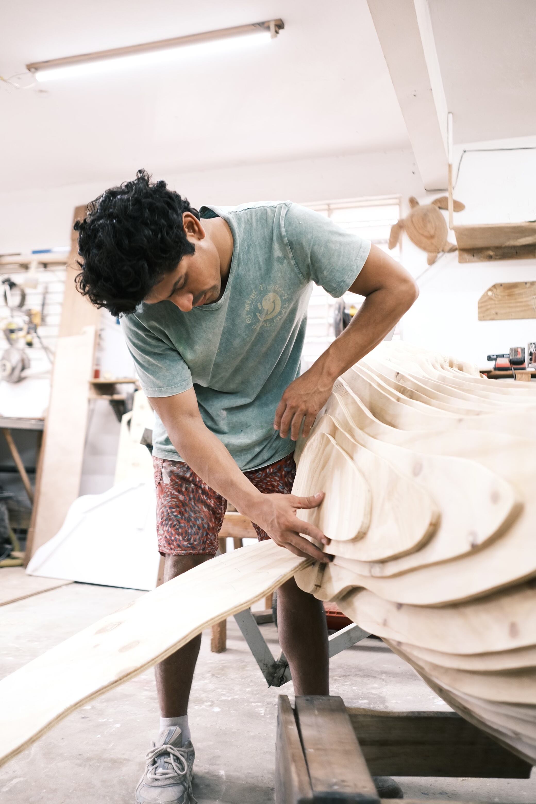 “Siempre vi las tablas de “surfing” como una escultura, una pieza de arte funcional, con una silueta, unas dimensiones y un volumen particular. Entonces aprendí por mi cuenta a hacer mis propias tablas, además de otras que vendía a amigos”.