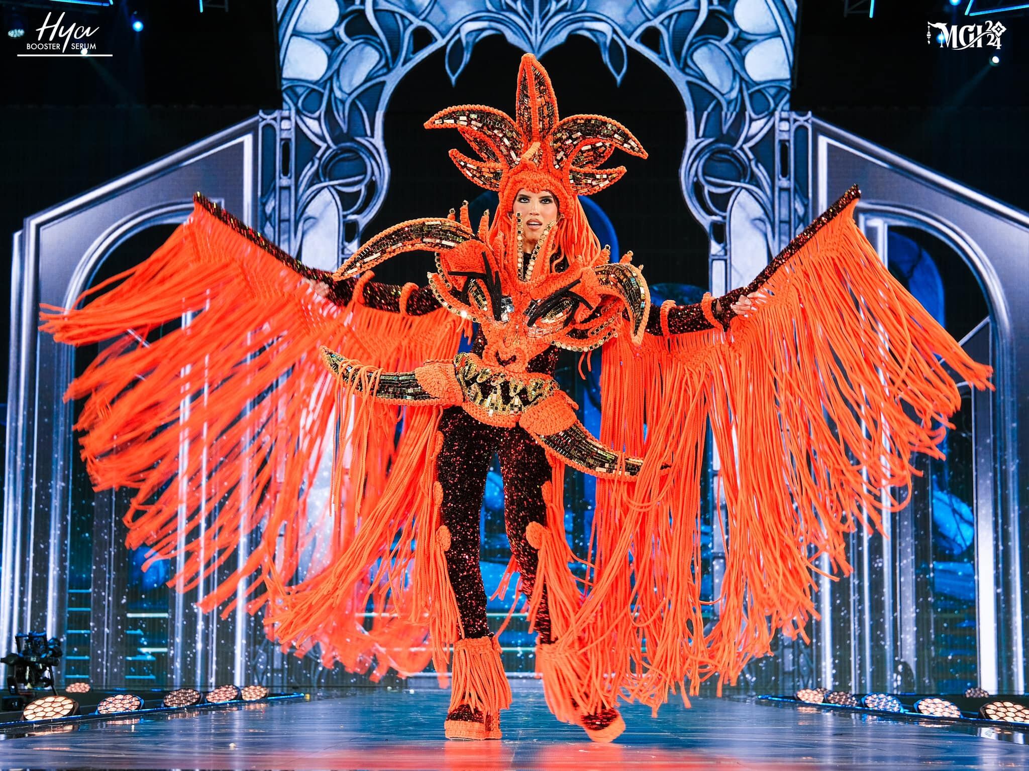 El traje, de color negro y naranja, cuenta con un enorme vejigante en el pecho de Miss Grand Puerto Rico 2024.