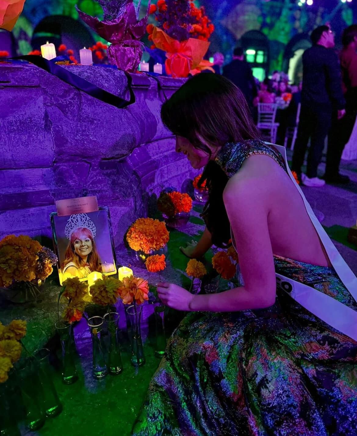 En medio del evento “Gala de las Catrinas”, donde las más de 125 candidatas que compiten este año lucieron sus mejores galas y maquillajes en honor a esta emotiva celebración mexicana, la beldad boricua, de 36 años, se acercó al altar de muertos, donde se encontraban las fotos de las ganadoras de Miss Universo que han fallecido, para rendirle respeto a la reina madre de Puerto Rico.