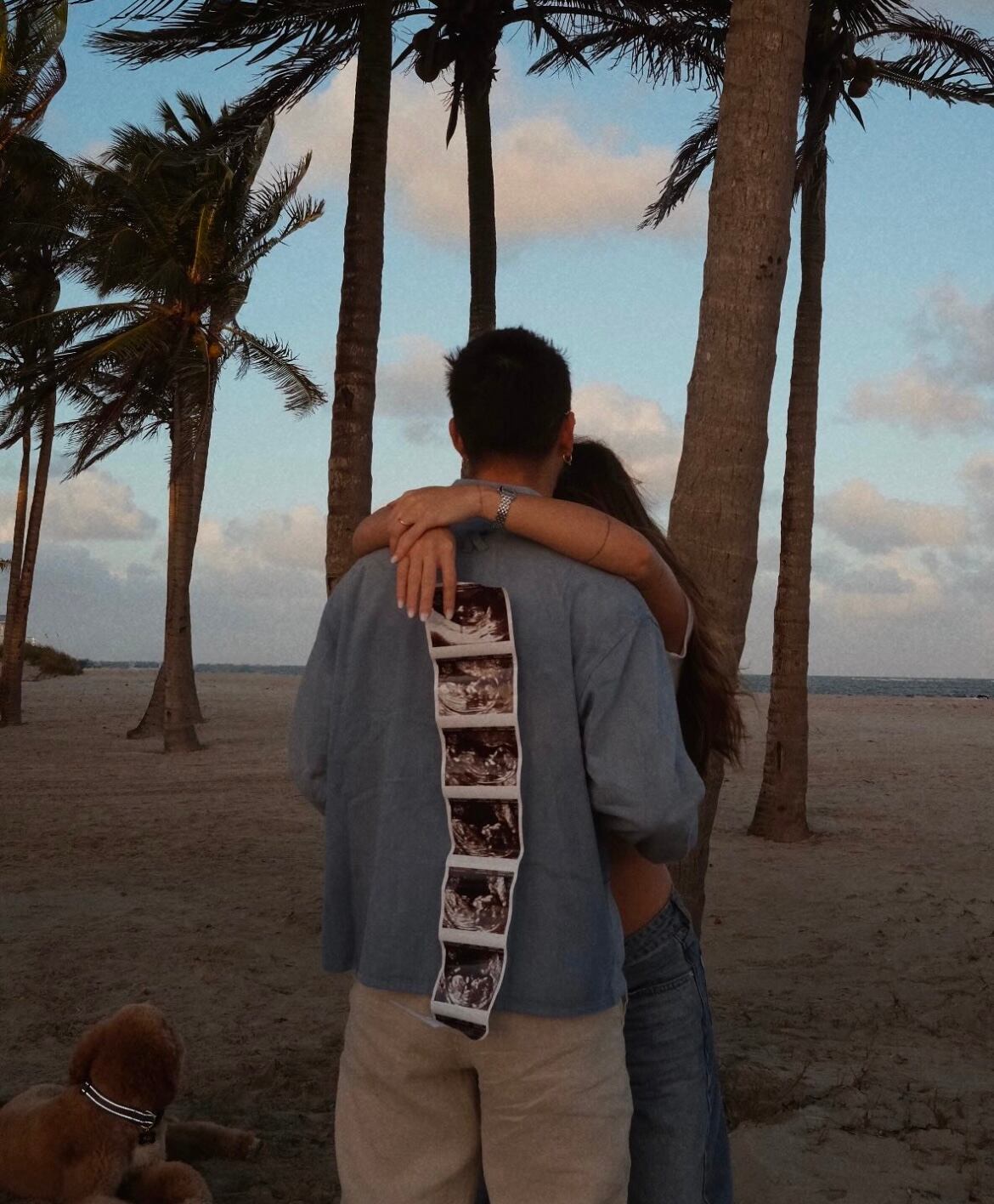 La pareja que lleva junta desde hace más de un año, hizo publica la noticia de la espera de su primogénito en una publicación en conjunto, mientras sostenían la copia de un sonograma en una playa.